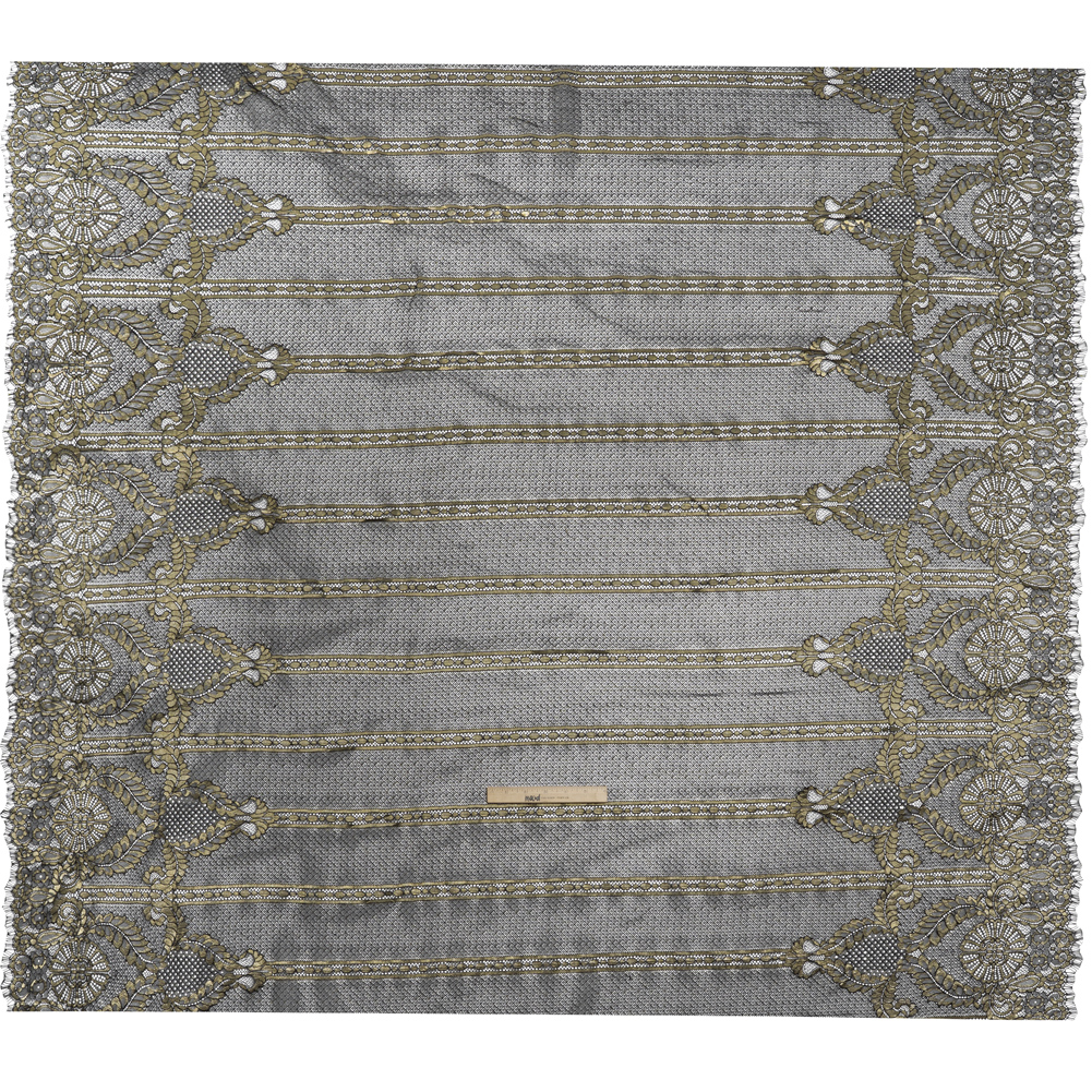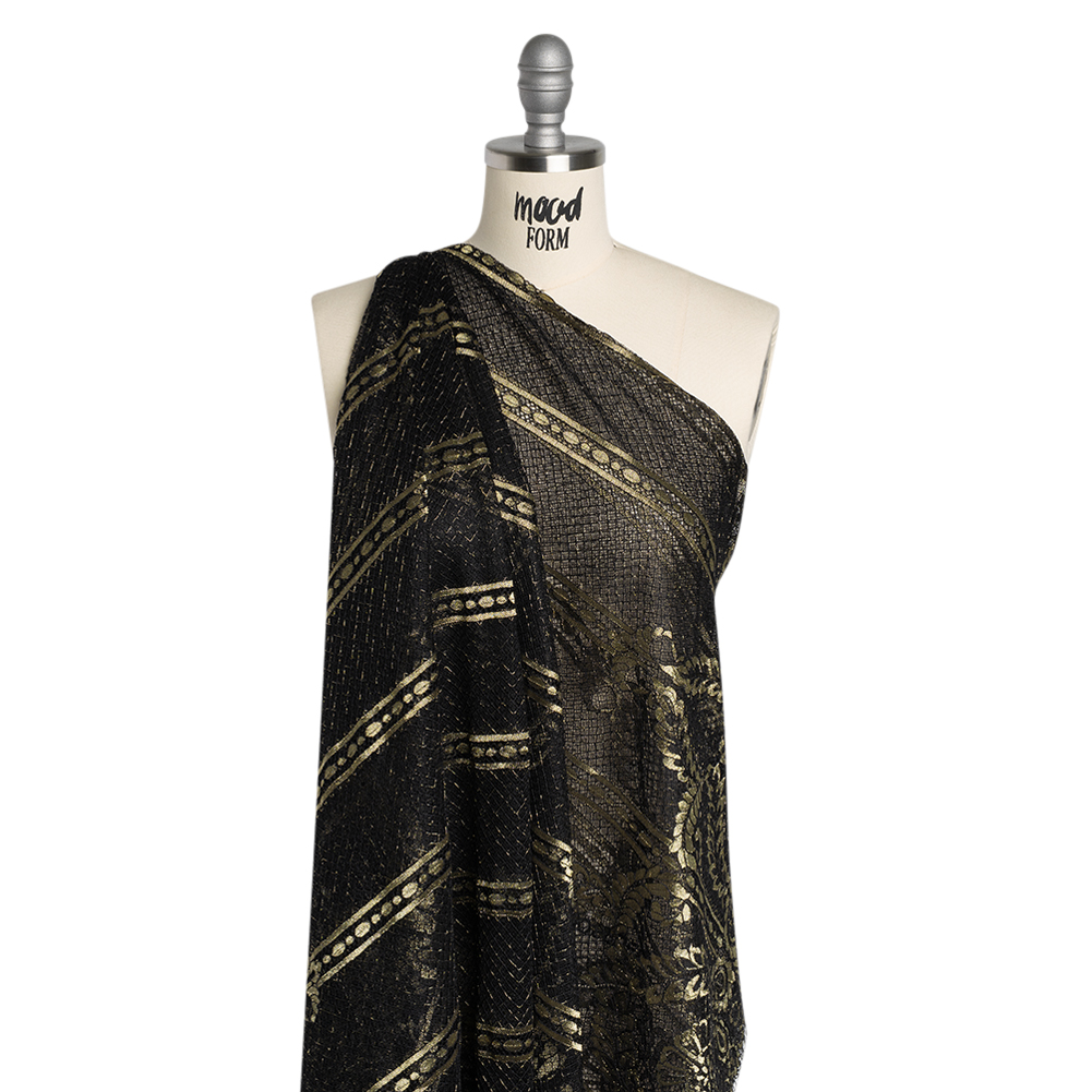 Divine your design dreams out of this Black and Gold Stripes and Diamond Lattice Metallic Re-Embroidered Raschel Lace—featuring a soft, tactile hand and airy, fluid drape.Suggested Projects: Dresses, Skirts, Blouses, LingerieContent: 60% Nylon 40% MetallicStretch: NoneOpacity: SheerA black lattice unfurls across this raschel lace, as bold gold threads stripe its length and a blooming floral border graces the finished edge—like a tale etched in thread. With a silky, textured hand and an airy, fluid drape, it dances with every breeze, ideal for gowns that whisper through moonlight and silhouettes spun from dreams. The finished edge offers ease for your enchanted creations: waterfall skirts, ethereal blouses, fairytale overlays, and romantic lingerie. Naturally sheer, consider layering or lining for a touch more mystery.