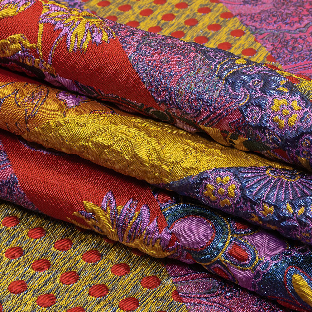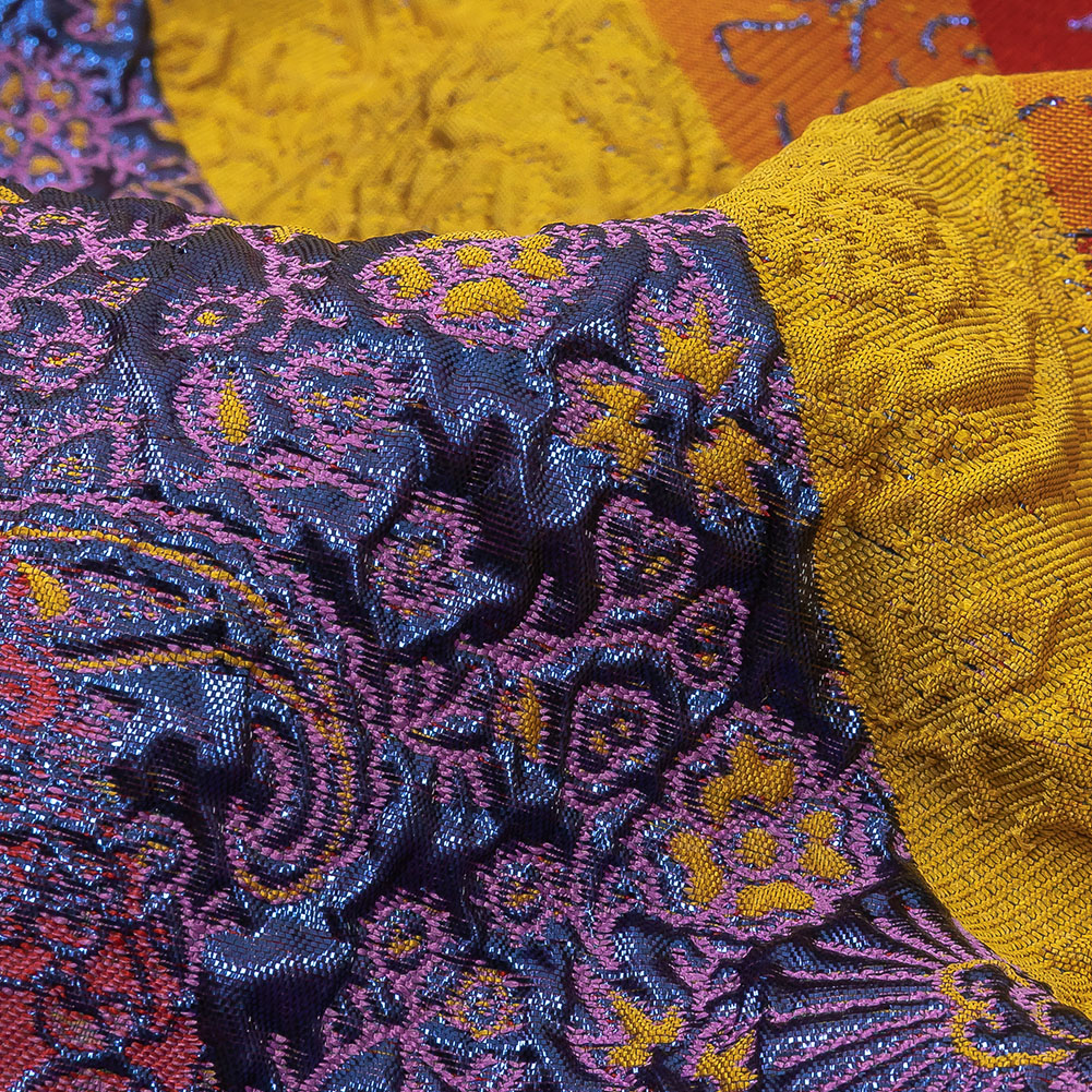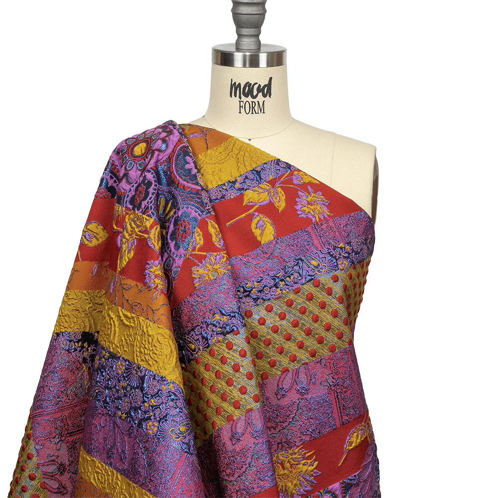 Who says quilts can't be couture? This Metallic Red, Royal and Goldenrod Patchwork Diagonal Stripes Luxury Brocade proves all the naysayers wrong! With a complex diagonal patchwork pattern pre-woven into the design, spending hours pre-sewing patchwork fabric strips are a thing of the past! Enjoy the sumptuous red, mustard, and royal purple hues, dazzling in alternating coarse metallics and soft matte textures. With patterns ranging from polka dots to paisleys and a malleable, somewhat bouncy drape, bomber jackets and trousers are just as feasible as jumpsuits and statement evening wear. Opaque, we suggest a lining for a professional finish, particularly on any tailoring applications.