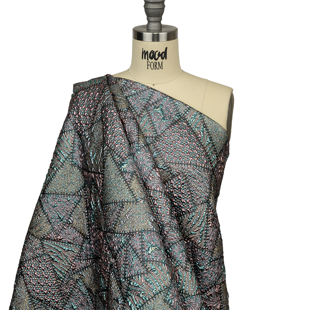 With this Metallic Rose Gold, Air Blue and Cream Gold Crazy Quilt Patchwork Luxury Brocade, live the dream and join the Nightmare Before Christmas family. Various geometric patches tumble erratically across the face, each featuring a different pattern in rose gold, gold, and light blue shades. With a metallic finish and plenty of texture, this flexible, voluminous fabric is made for luxury pleated skirts, corsets and crop jackets, duster robes from the dynasty era, avant-garde gowns, and so much more. Though opaque, a lining is recommended for comfortability purposes.