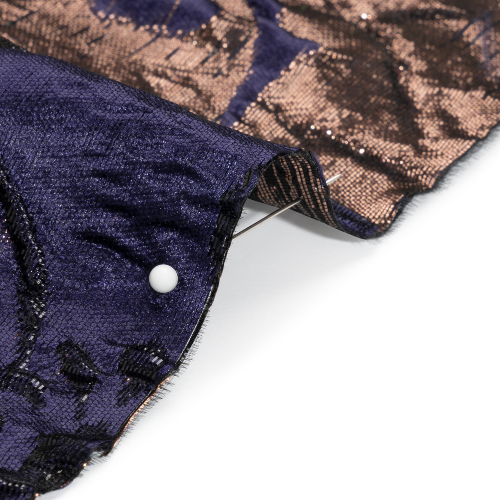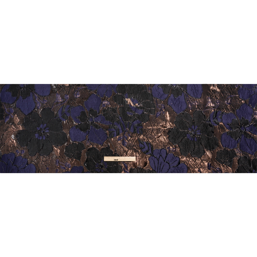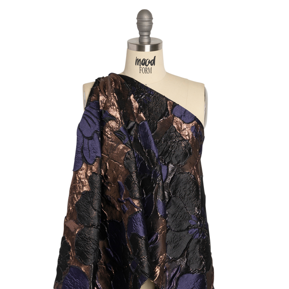 Enter the midnight gardens of this Metallic Rose Gold, Black and Navy Floral Luxury Brocade! Navy and black flowers grow against a rose gold background. Along with the sleek hand, embossed petals and embroidered-like outlines of flowers texture the face. This dimensional surface, created by additional weft threads in the weave, is what separates brocades from other fabrics. The complex weave produces a sophisticated feel that becomes exceedingly luxurious with metallic threading. With a semi-structured yet voluminous drape, conjure up elegant ball gowns, sheath dresses, wide circle skirts, structured jackets, and more. For extra luxury, we suggest lining this fabric with our silk habotai to combat its semi-translucent nature.