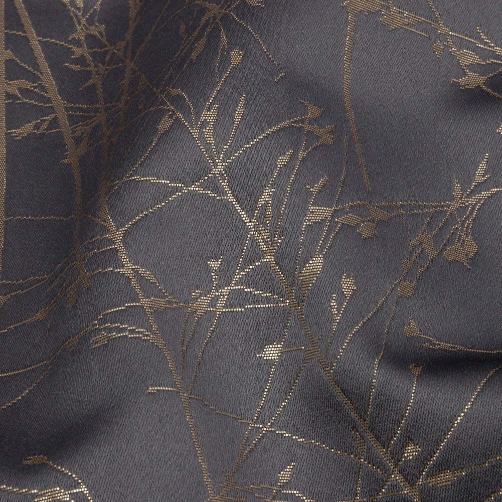 Hidden from the light, discover this British Imported Mole Delicate Grasses Metallic Satin-Faced Drapery Jacquard. At the edge of a forest, thinning golden grasses shine against a lustrous gray background. The Jacquard weave structure paired with the added satin base give the face a tactical but smooth feel. With a flexible drape and no stretch, create dramatic drapes, long, pooling curtains, elegant swags, valances, or even light upholstery projects like throw pillows and seats. Mostly opaque, a lining can be added to lessen sun exposure but is not needed for most projects.