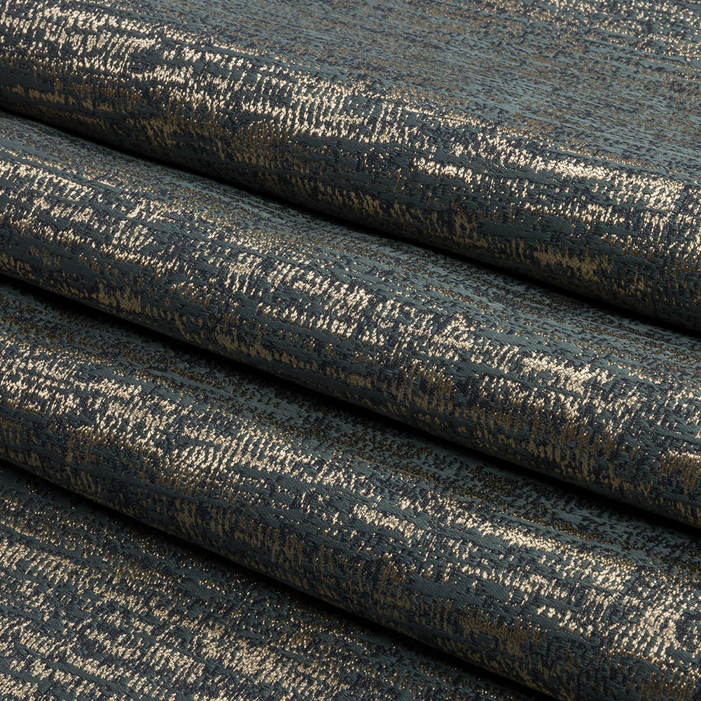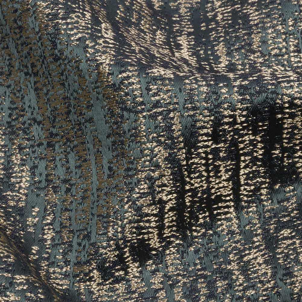 Moonlight ripples across this British Imported River Distressed Metallic Satin-Faced Drapery Jacquard. Gold and blueish-gray threads, woven in a seemingly sporadic design, evoke the look of a distressed metal face. This fabric is teeming with color, luster, and texture. Both the satin face—producing a wonderful sheen—and the Jacquard weave—yielding an embroidery-like feel—make this fabric undeniably complex and stunning. With a flexible drape and no stretch, create dramatic drapes and long, pooling curtains, elegant swags, and valances, or even light upholstery projects like throw pillows and upholstered headboards. If desired, a lining can be added to lessen sun damage, but it's not needed for most projects.
