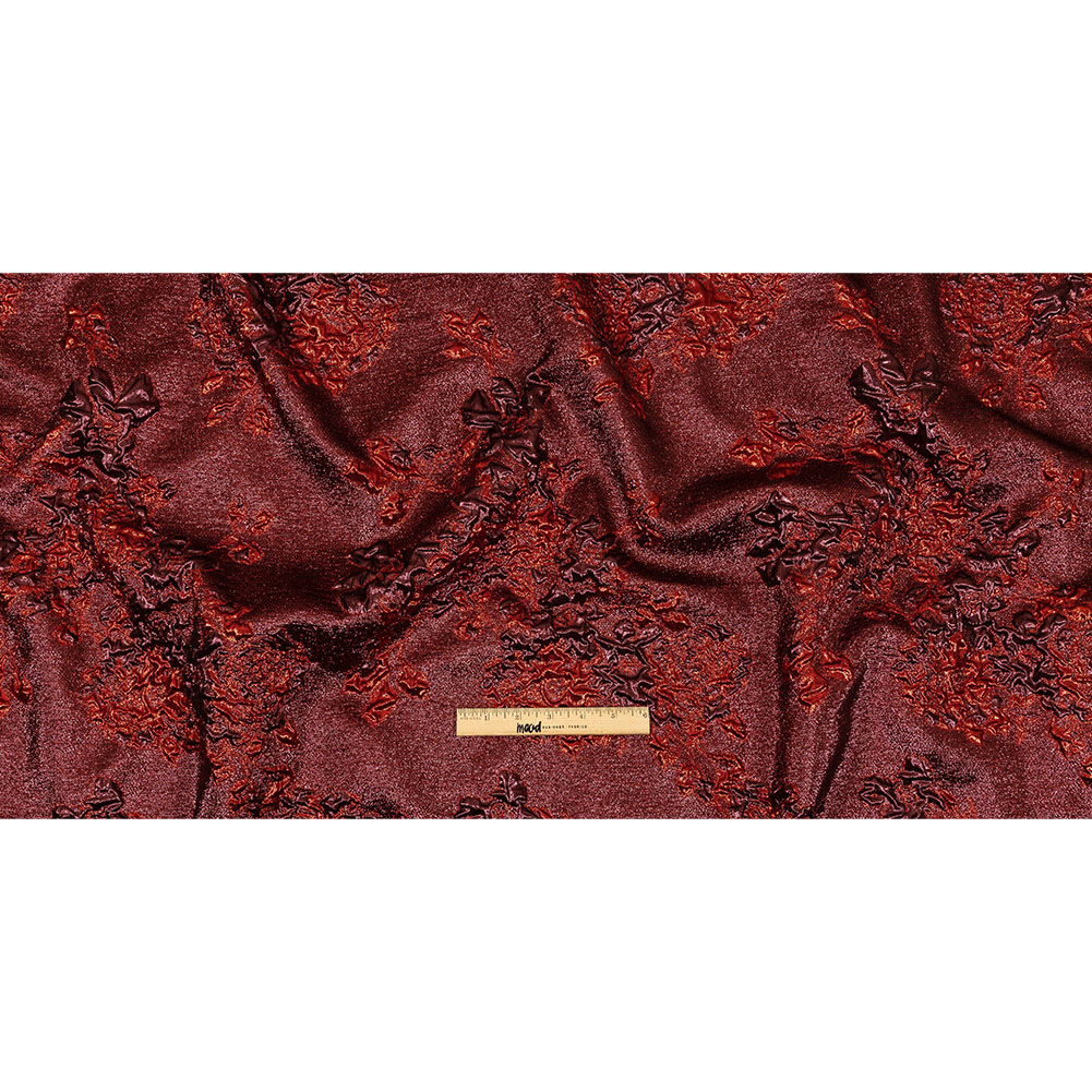 Packing a passionate punch, Mood's Metallic Scarlet and Burgundy Floral Luxury Brocade is a fabric perfect for luxe date nights. Textural puckers, in shades of scarlet and burgundy, form abstracted florals, blooming throughout a crackled, glittery face. Without stretch but with a pliable drape, take advantage of the sublime sparkle to fashion show-stopping ballgowns and matching ensembles, complete with pleated, voluminous skirts and structured bodices sure to take anyone's breath away. Opaque, a lining would only be suggested for protection from fraying at the seams or added comfortability.