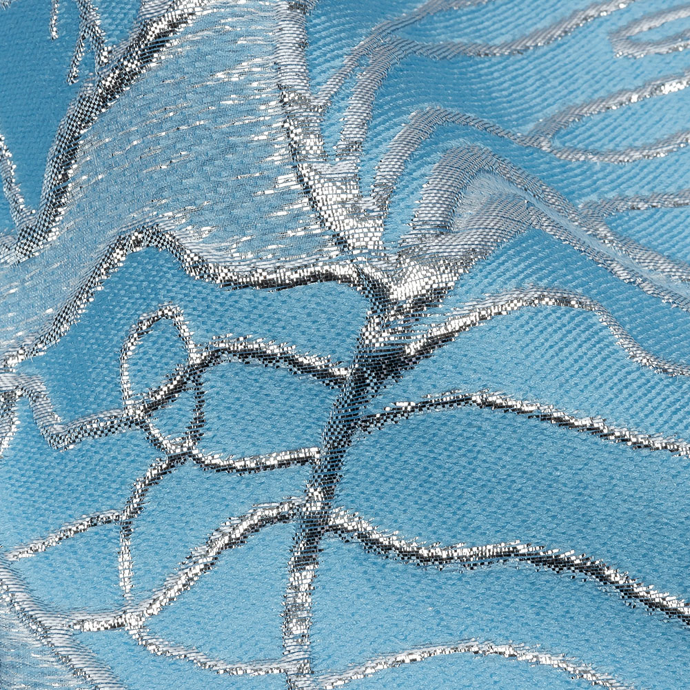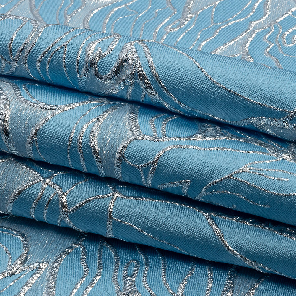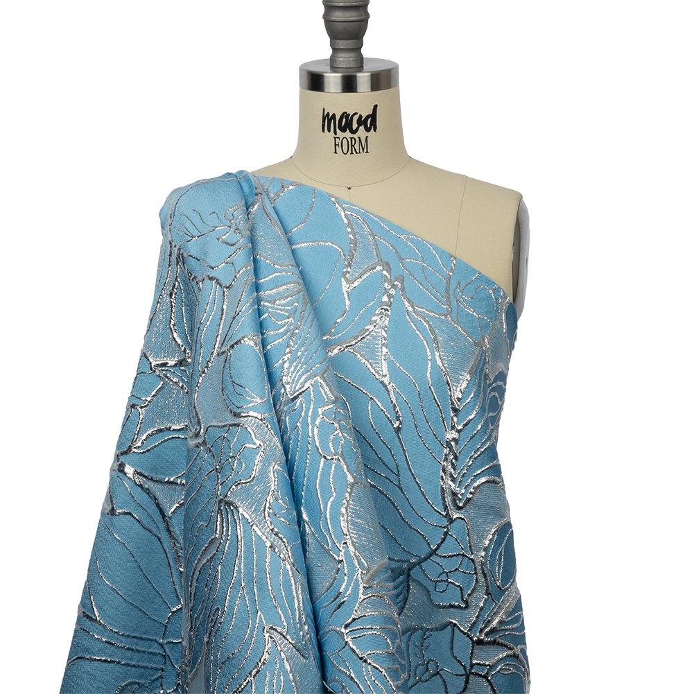 Heavenly tears adorn this shimmering, pastel-toned Metallic Silver and Baby Blue Outlined Florals Luxury Brocade. Metallic lines swirl over a solid backdrop in intricate floral patterns, adding a crisp hand and slightly raised texture. Without stretch, it offers a malleable yet slightly structured drape. Craft dresses, ballgowns, full skirts, or evening shawls! Although it is opaque, a lining is recommended for comfort in wear.