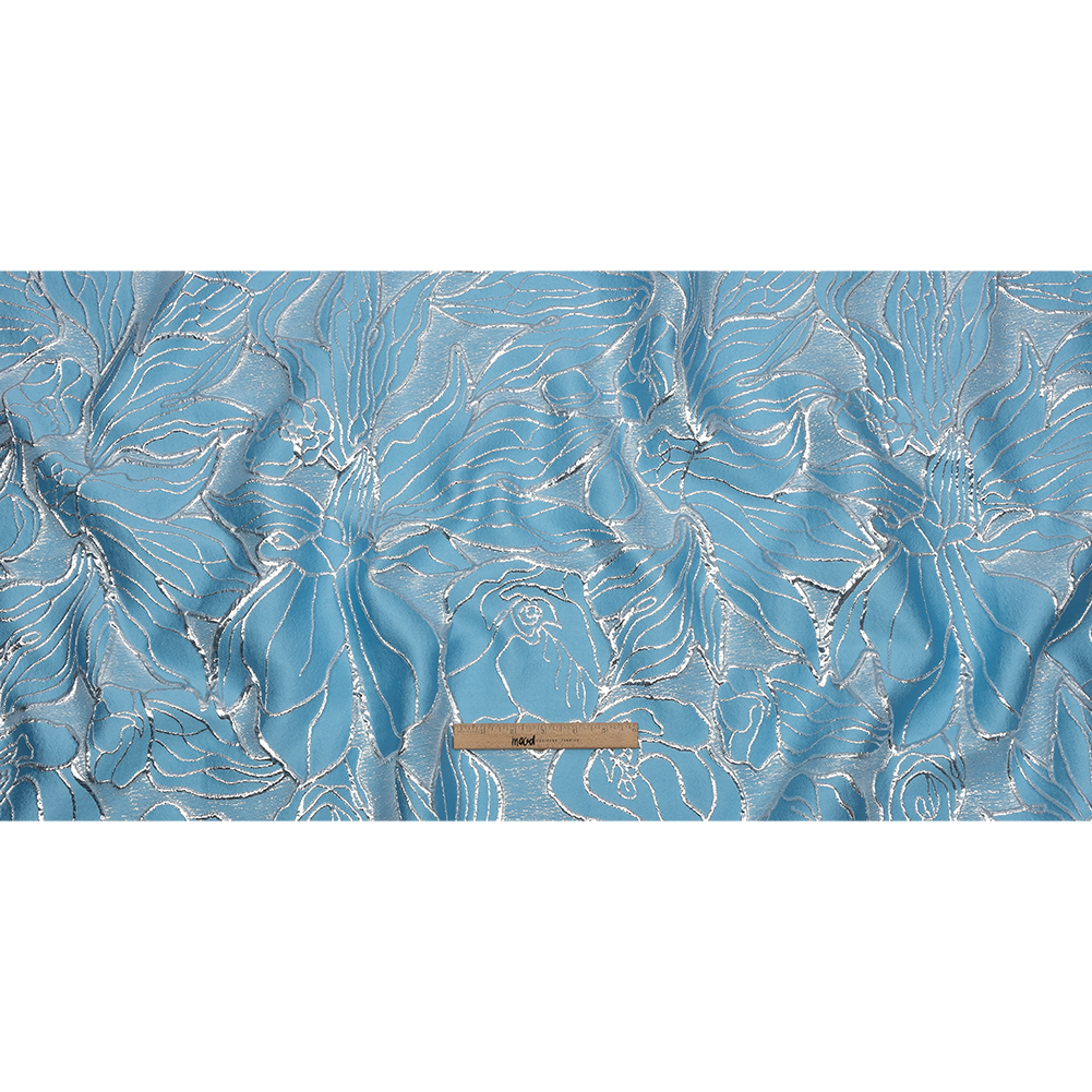 Metallic Silver and Baby Blue Outlined Florals Luxury Brocade