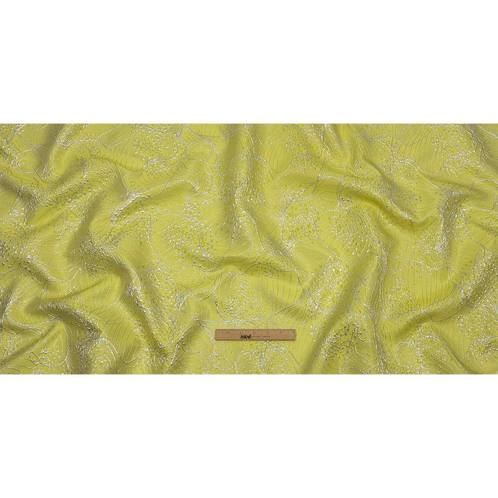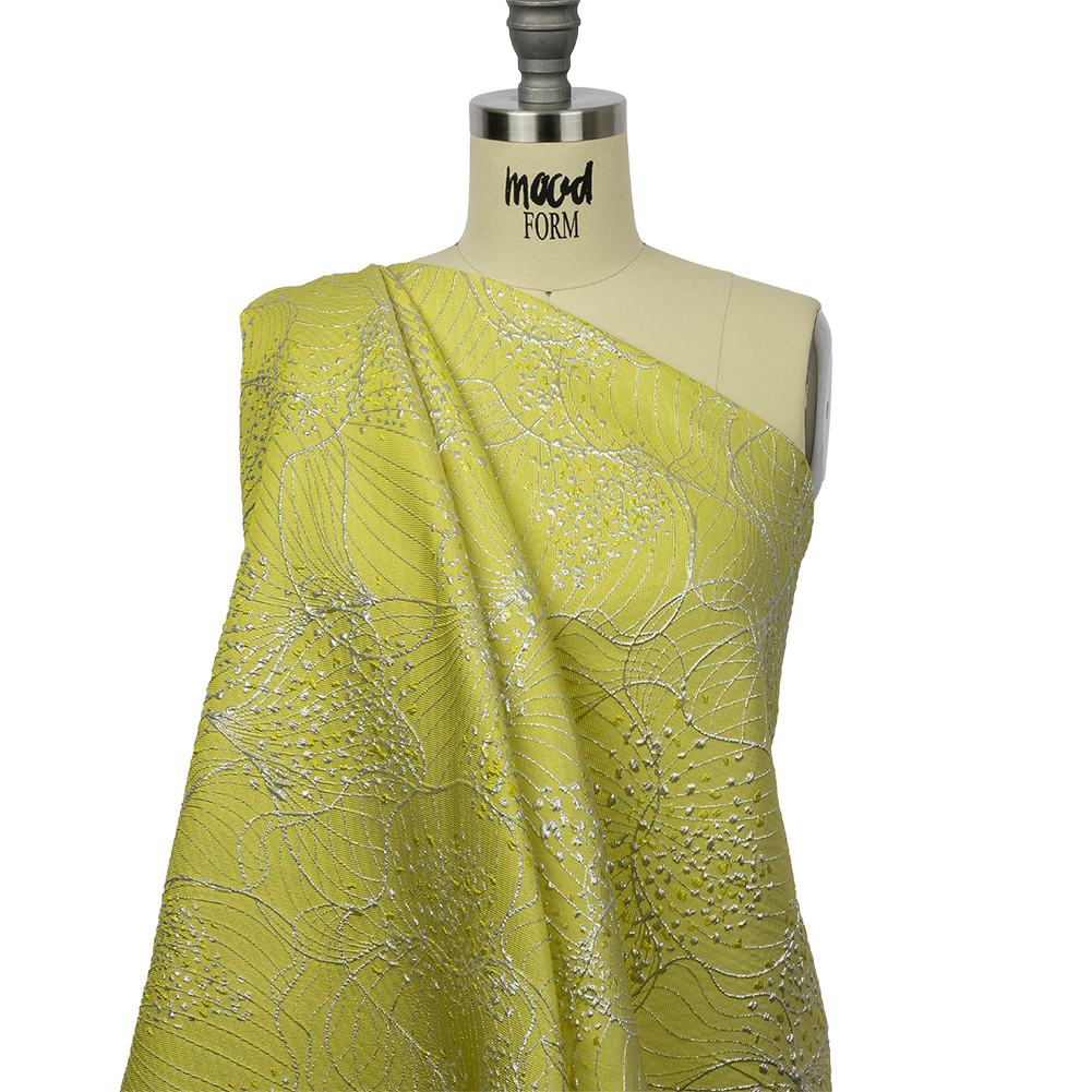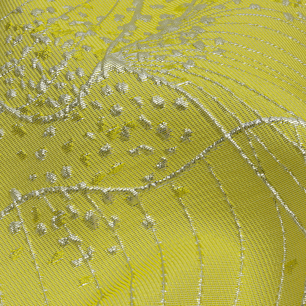 Create something spectacularly sweet-tart with this Metallic Silver and Lemon Lines and Dots Luxury Brocade. With an almost floral effect overall, the softly ridged lemon yellow base will keep you on your toes with a tactile topping of raised lines and dots, plus a crisp finish thanks to the metallic threads. Use the structural yet pliable drape for voluminous gathered skirts with matching structured bodices, gowns, perfectly tailored suit jackets, blazers, sarees and so much more. While opaque, a lining may be added for comfort in wear.