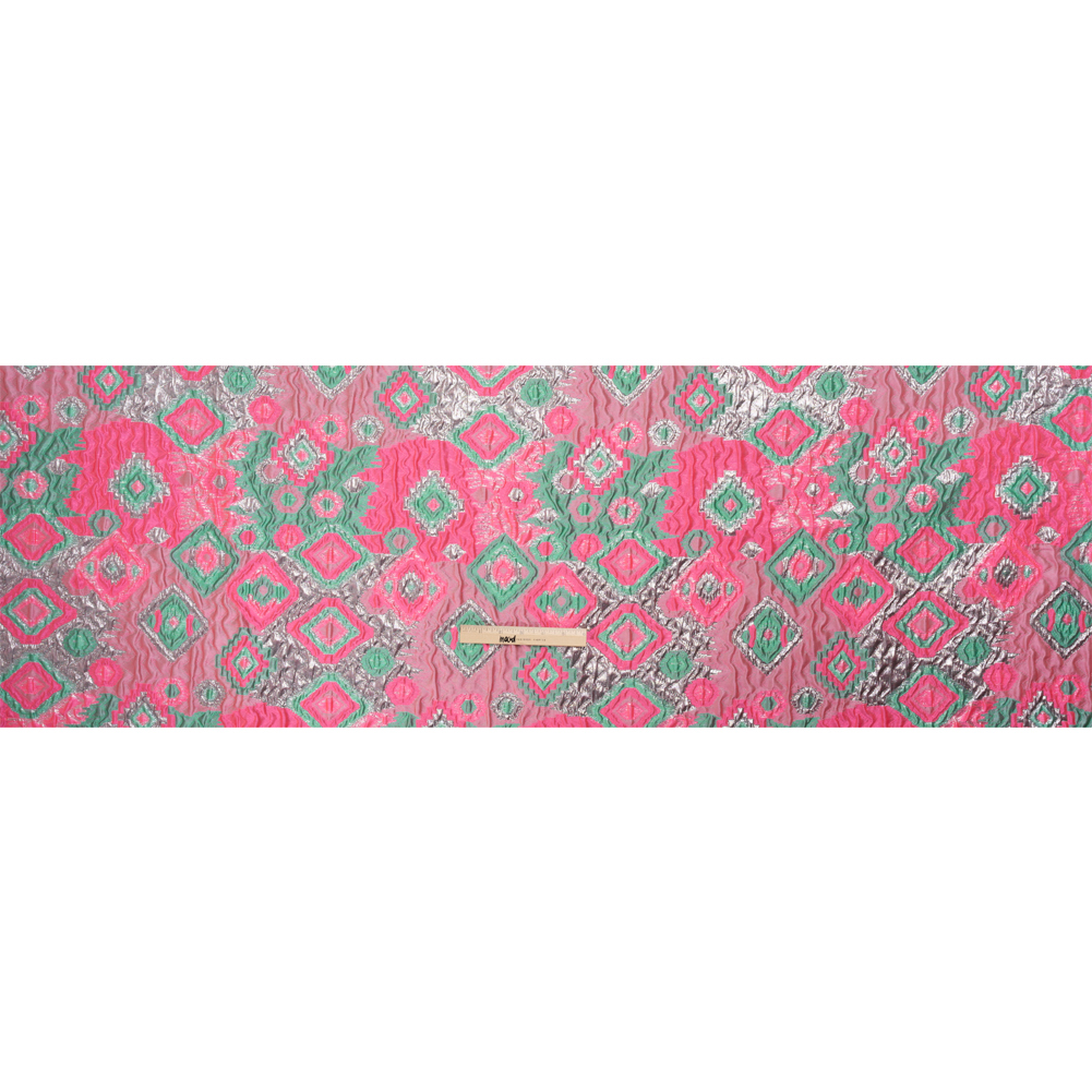 Cotton candy skies shine brightly on this Metallic Silver, Hot Pink and Sea Green Diamond Skies Luxury Brocade. A pink, sea-green, and silver sky hosts different-sized diamonds of the same vibrant colors. The lustrous background is lined with zig-zags that bubble up like they've been embossed, giving the sleek hand a dimensional and spongy texture. The malleable yet voluminous drape lends itself well to beautiful gowns, circle skirts, structured jackets, and sheath dresses. For extra luxury, we suggest lining this fabric with our silk habotai.