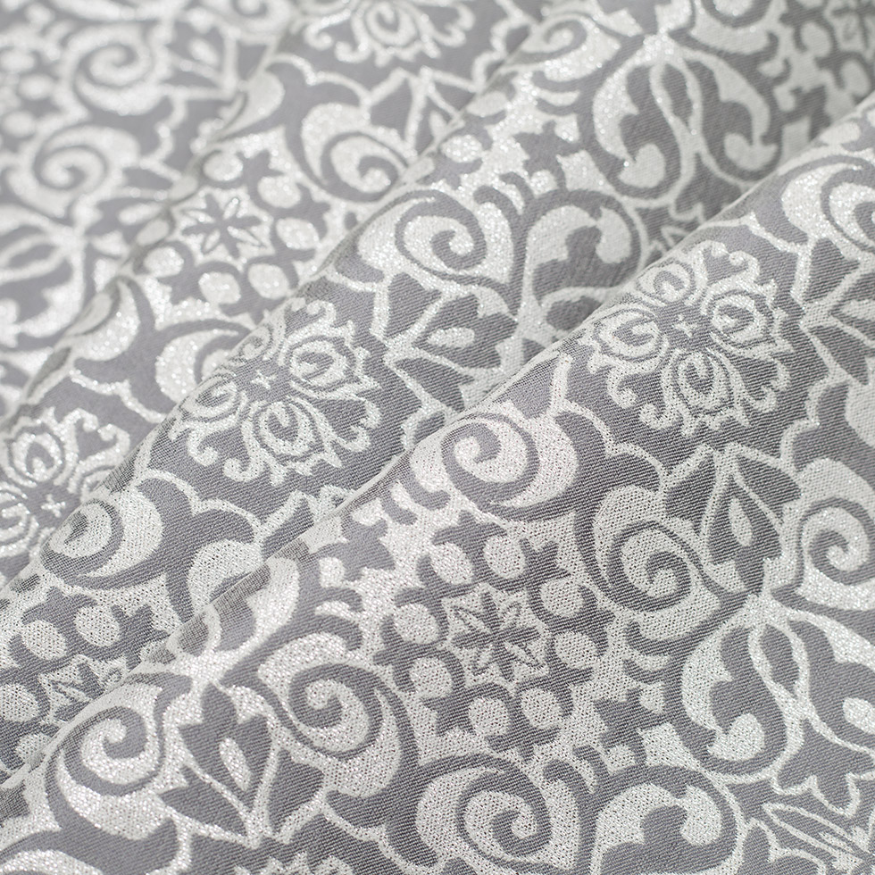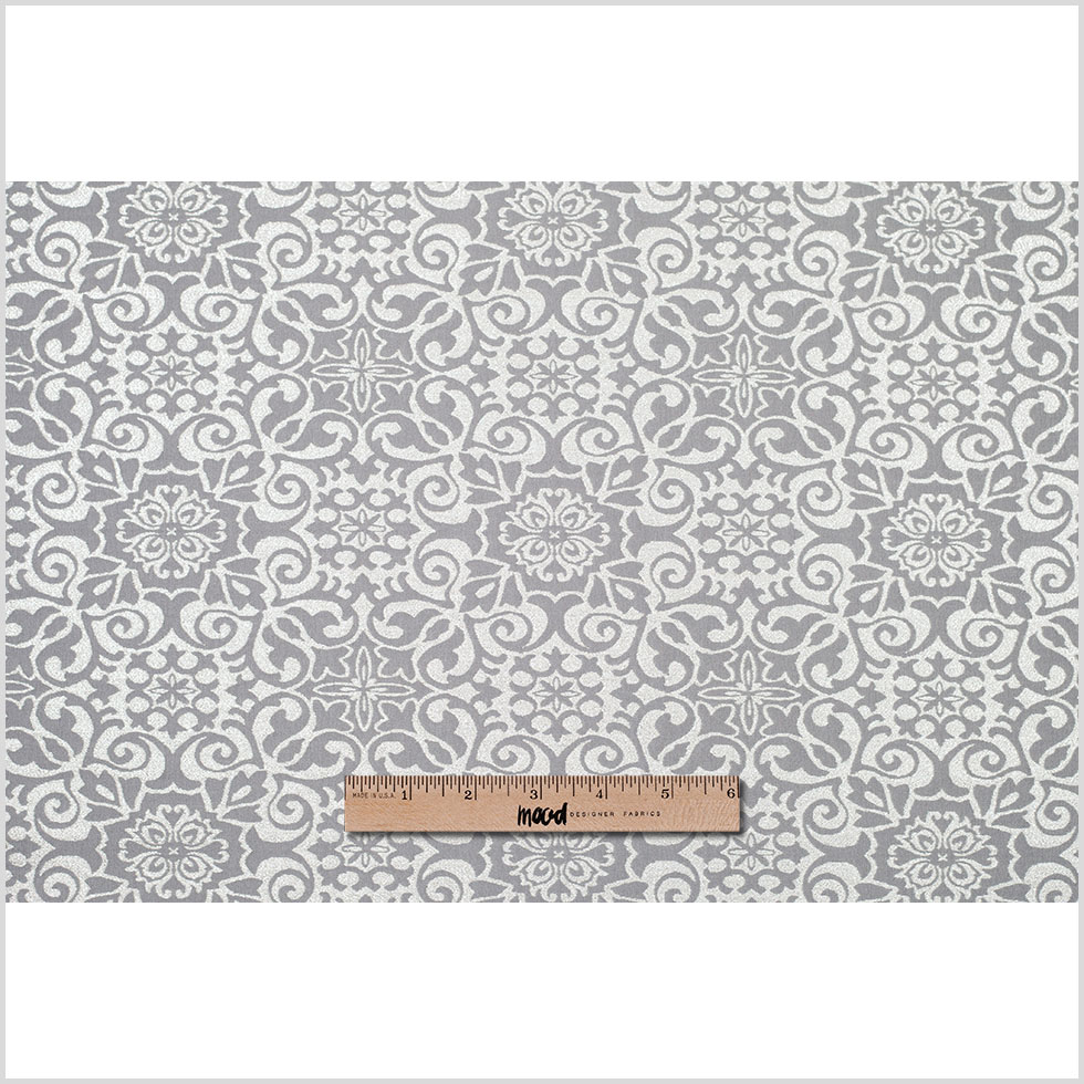 Get prepared to be completely dazzled by this shimmering metallic fabric! Here, we have gray and white acrylic brocade layered with metallic silver lurex yarns in a glittering floral pattern.