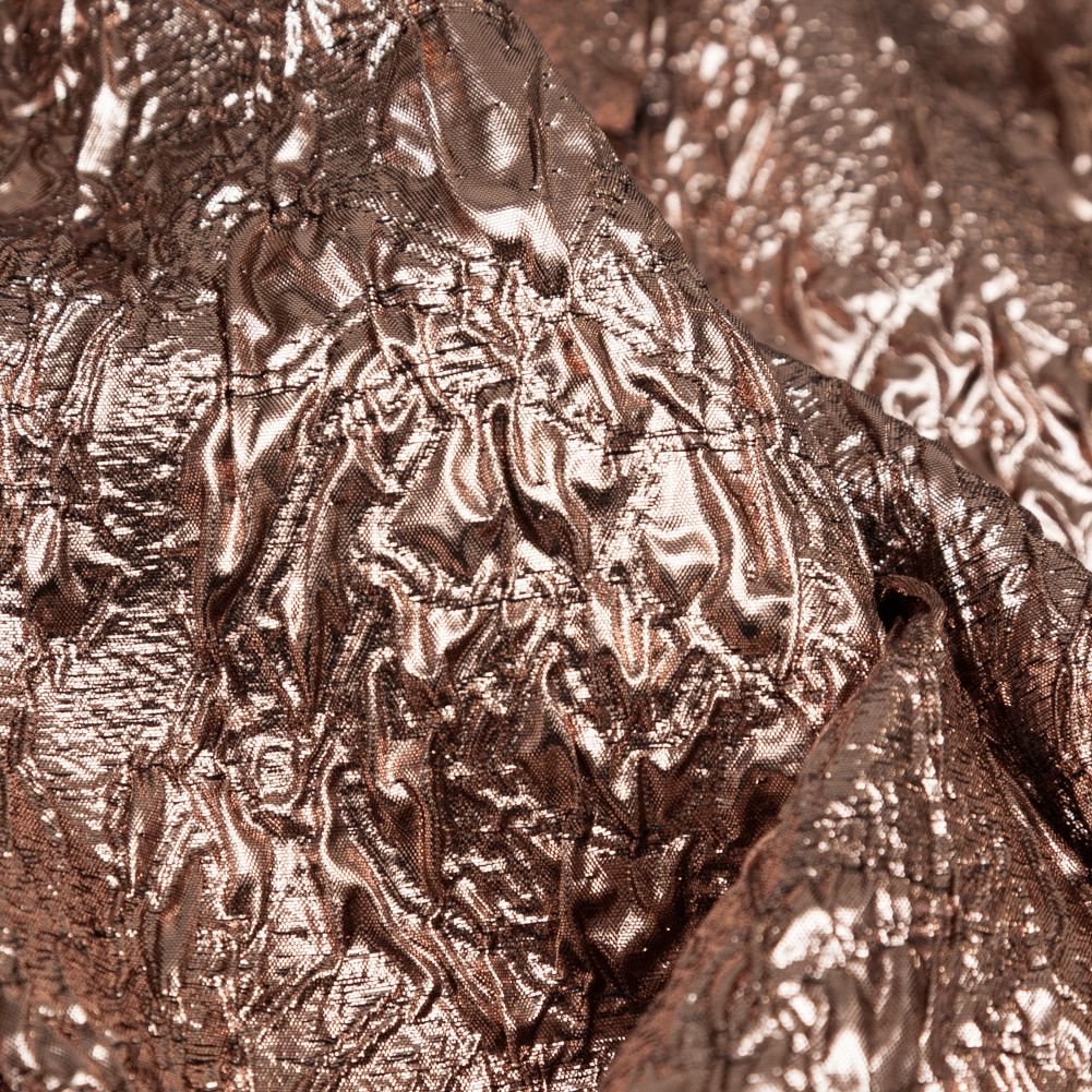 Towering tropical trees sway in the bay breeze, warming themselves on the surface of Mood's Metallic Teak Crinkled Luxury Brocade. Its foiled face falls and folds, a textured topography teeming with mountains high as the heavens. Riveting and rippling, light reflects and radiates from the scratchy top layer, while the backing is soft and smooth. Encase yourself in evening attire made of this brilliant brocade, in flared gowns, light jackets, and full skirts that complement its whippy and voluminous drape. Without stretch and mostly opaque, a lining is recommended for increased comfort and structure. Please note, this fabric weighs 104 GSM.