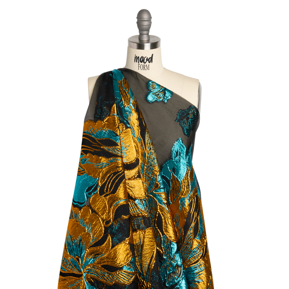 Bask in the elegance of this Metallic Teal, Orange and Black Floral Luxury Burnout Brocade Panel! The magnificence of the copper and teal metallic threading matches the sheer magnitude of the flowers, displayed on a breathtaking panel measuring 61” by 62”. The feel of the flowers is sleek, grainy, and three-dimensional as they rise slightly from the puckered black mesh. Either as an overlay or paired with a silk habotai lining, this semi-structured fabric conjures up dream-like ball gowns, voluminous circle skirts, and more.