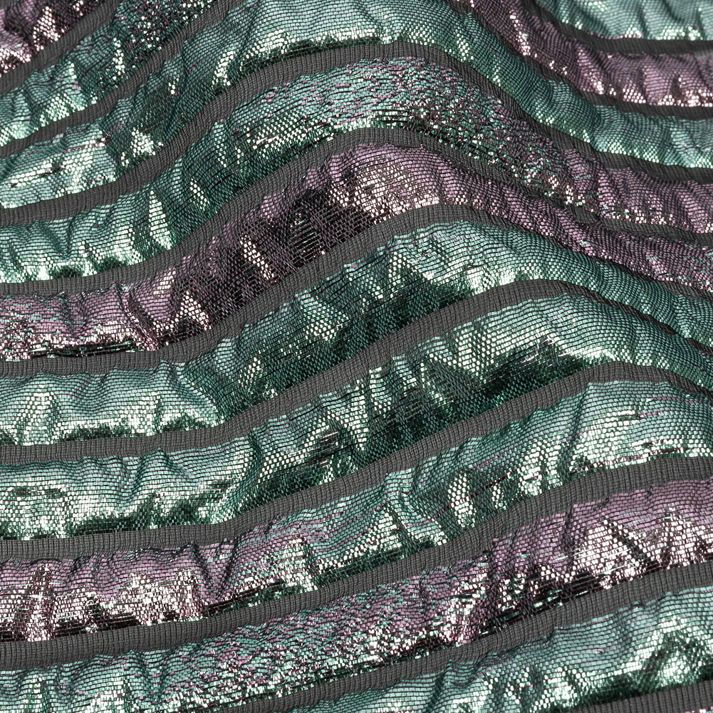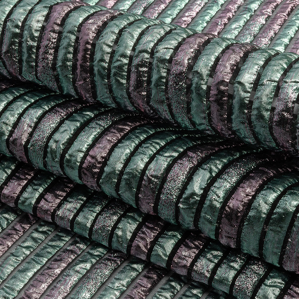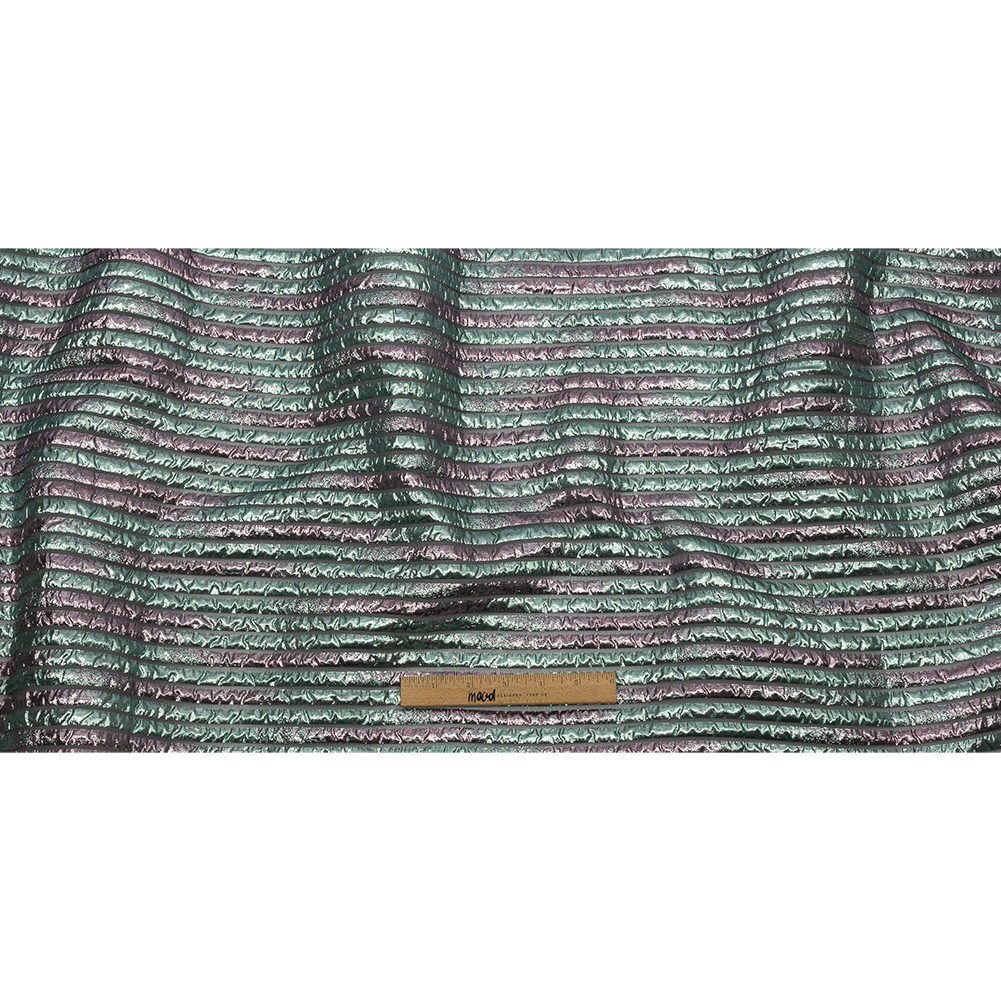 Add color to any occasion with this Metallic Turquoise Blue and Rouge Pink Luxury Striped Burnout Brocade. Shimmering stripes form a bubbly, almost ribbed texture between narrower lines of sheer black organza where the design is burned out. Use its voluminous, malleable drape to make semi-formal dresses, gowns, bell dresses, sarees, shawls, blazers, vests with matching suit jackets, and so much more! While opaque, a lining may be desired for comfort.