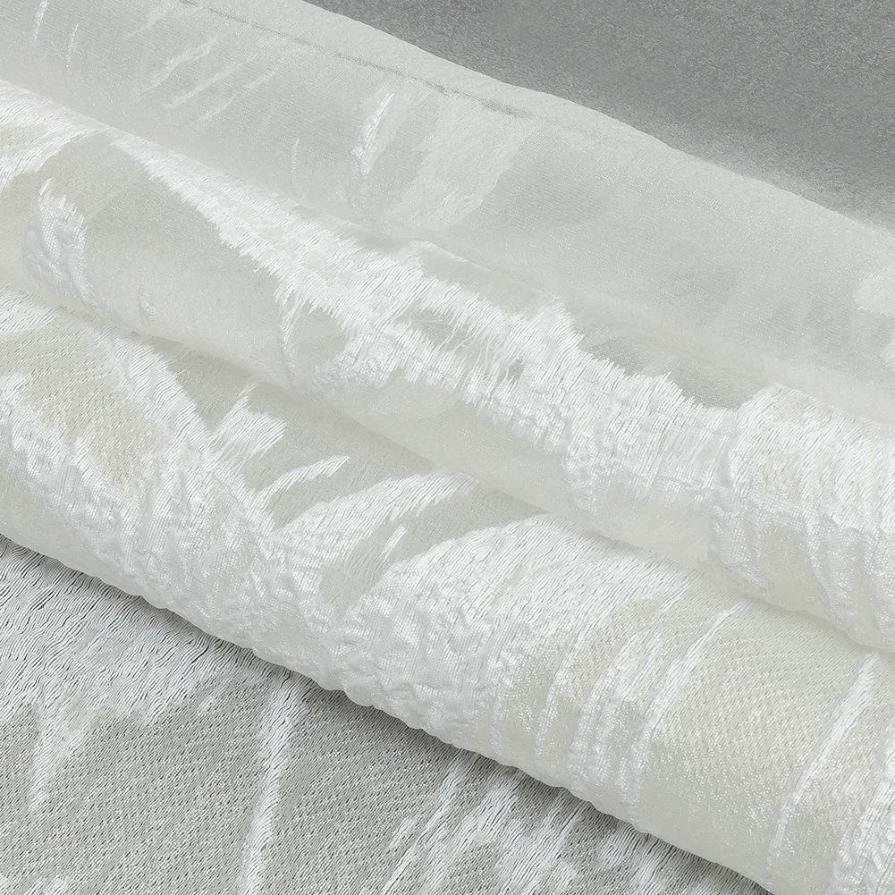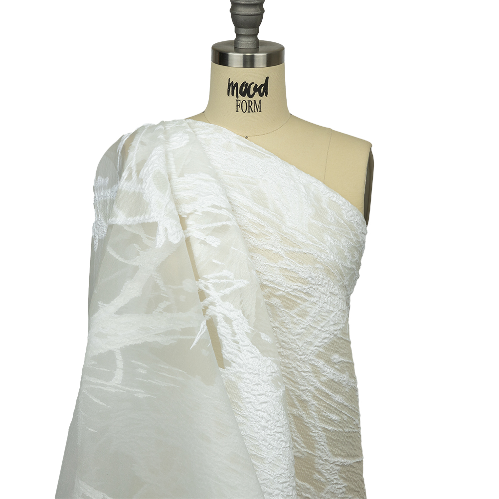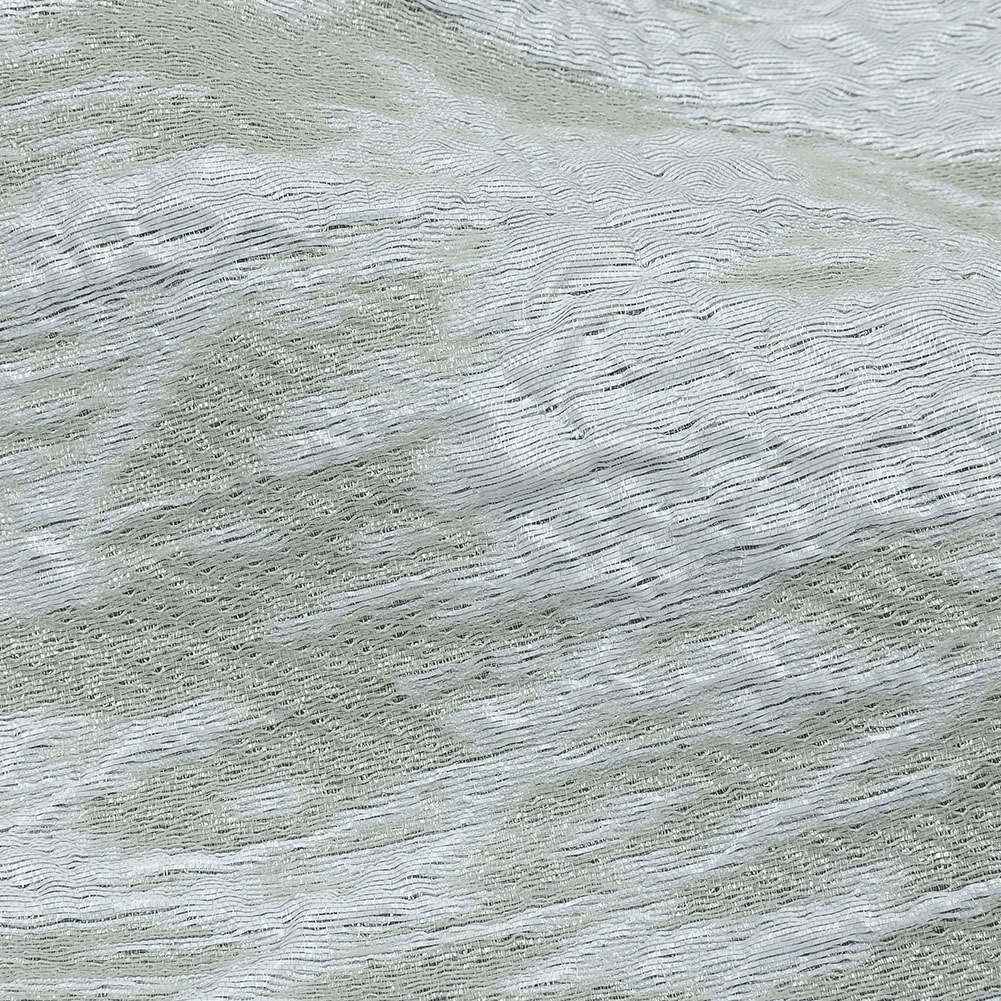 Feel like crystal quartz and shine with this Metallic White Abstract Splatters Luxury Burnout Brocade. Featuring a crinkled hand without stretch, a sheer white ground is burned out around an abstract, splattered pattern. With a flexible drape, create Lehenga Cholis, vintage opera coats, Sharara suits, and evening or bridal gowns. Transparent, use this as an overlay on a colorful fabric for a peek-a-boo effect, or a lining can be used for comfort and modesty if desired.