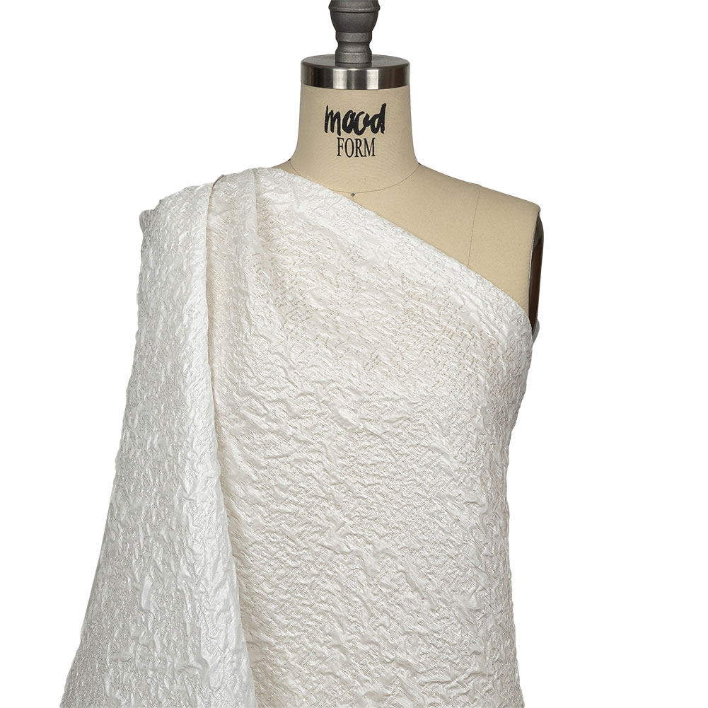 Glitter and gleam in Mood’s Metallic White Crinkled Luxury Brocade, simply made for eye-catching evening wear! So named due to its crinkled texture, the face features an all-over sparkly white coloring, reminiscent of fresh snow.