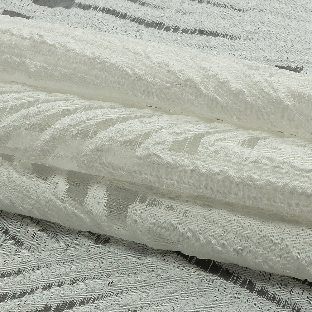 Brides will absolutely sparkle in this Metallic White Overlapped Nested Triangles Luxury Burnout Brocade. Nested triangles overlap in a feather-like fashion, accented by burnout sections for a touch of sheer luxury. With a shimmering metallic finish, the fabric offers a crisp, bumpy hand. Use its light but voluminous drape to make gowns, bell dresses, sarees, shawls, blazers, vests, and so much more! Transparent in part, a lining can be used for full opacity, or insert a lining of a contrasting color for a unique pop!