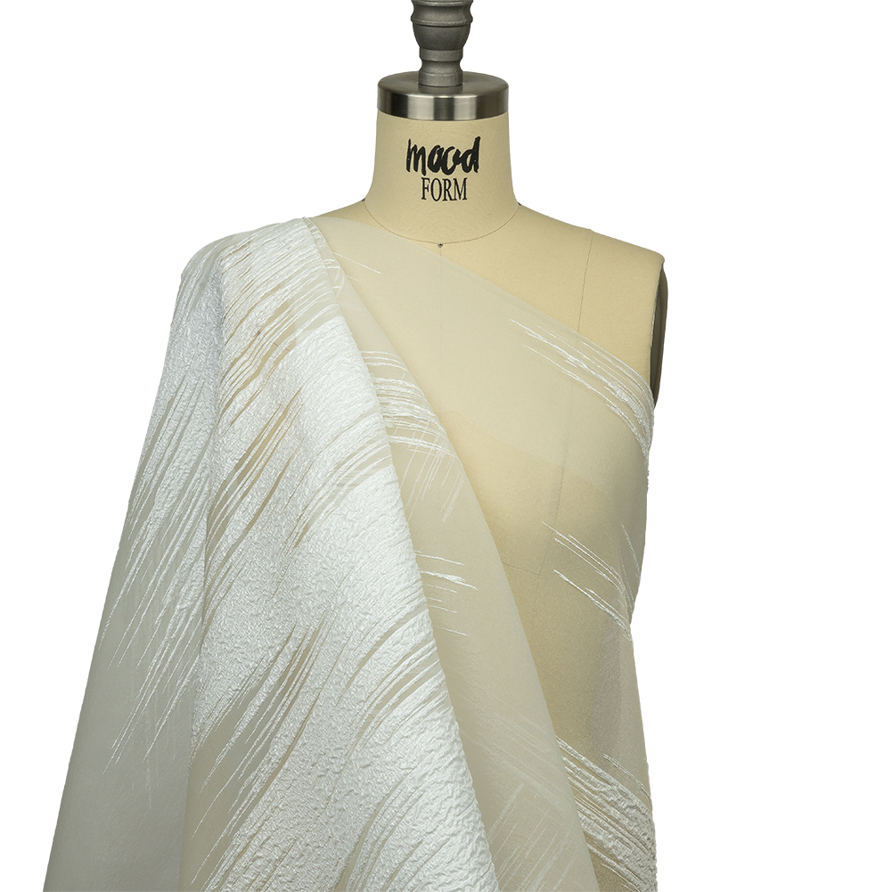 Combine a sleek design with dreamy shine using our Metallic White Sleek Streaks Luxury Burnout Brocade! Sparkling white streaks run across the white organza face providing the perfect opportunity for playing with the direction of the design. Tactile, structured, and voluminous, bring a little drama into your wardrobe with wide-leg jumpsuits, ballgowns, sheer neckline accents, and so much more. Primarily sheer, a lining or layering can be used to achieve full opacity and additional comfort when necessary.