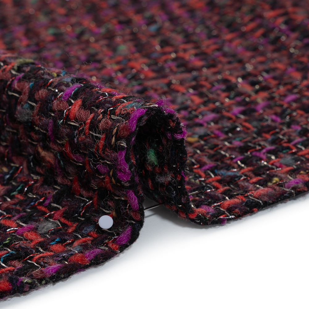 Play with movement and color when stitching masterpieces out of this Striated Metallic Wool Blend Tweed—featuring a soft, tactile hand and supple drape.Suggested Projects: Jackets, Skirts, Dresses, ShawlsContent: 60% Wool, 20% Polyamide, 18% Polyester, 2% LurexStretch: NoneOpacity: Slightly TranslucentBlack, red, purple, and metallic gold threads intertwine in a dynamic striated pattern, forming a bold, zigzag-like design with striking depth and shimmer. A tactile, thick weave lends this wool-blend tweed both softness and dimension, making it a versatile choice for casual and formal wardrobes alike. With its supple drape, it’s ideal for crafting statement button-up coats to weather the autumn chill, playful suit sets for afternoon affairs, or even cozy shawls for fireside layering. Slightly translucent, it pairs best with a lining to enhance comfort, warmth, and coverage.