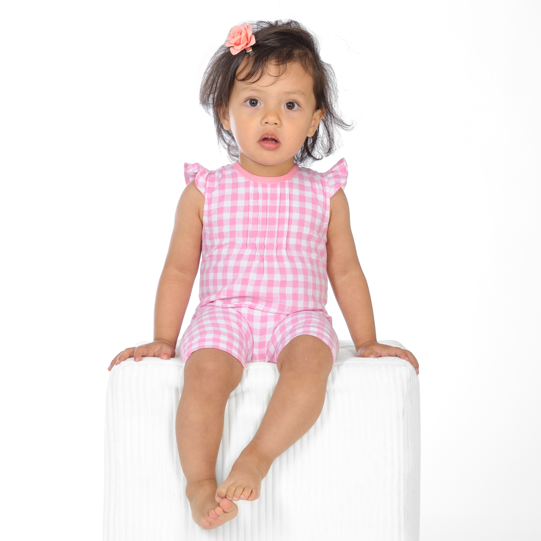 MIA is a comfy baby and toddler jumpsuit with a pleated neckline, ruffle sleeves, a back snap closure and cuffed legs. You also get a matching headband (one size with elastic) for a coordinated summer look. Perfect for warm days, vacations and handmade gifts.