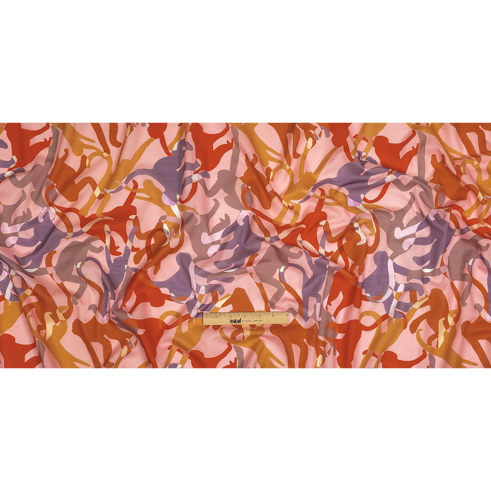 You’re never too old for monkeying around in our Mood Exclusive Barrel of Laughs Cotton Voile! Swinging monkeys, in vibrant red, purple, and orange shades, overlap on a bubblegum pink background, creating a frenzy of playful action.