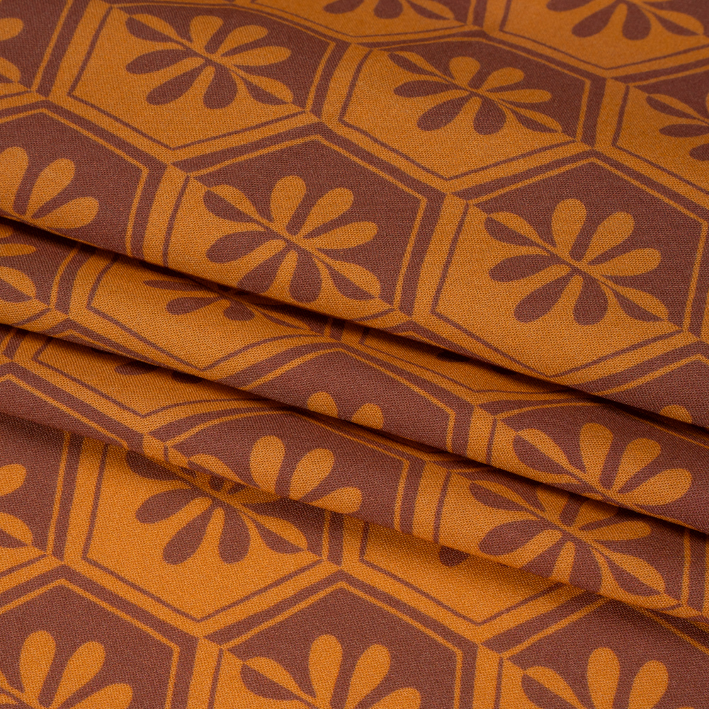 Buzzing with creativity, our Mood Exclusive Beehive Divine Drapey Viscose Woven is as sweet as honey. Burnt orange and brown paint a warm pattern rooted in the natural imagery of honeycombs and leaves. Crisp in hand, this lightweight woven drapes with a billowing movement that beautifully softens your form. Craft fluttering dresses, blouses with an elegant arrangement of gathers and flounces, and luxe loungewear. A lining may be desired as this fabric is slightly translucent.