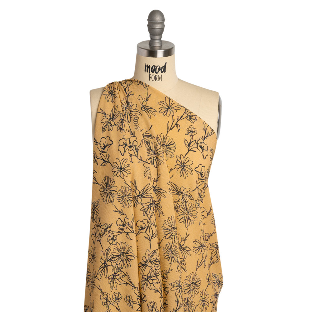 Our Mood Exclusive Beige Doodling Daisies Crinkled Gauzy Viscose Crepe translates nature to art as it displays black contour drawings of flowers against a tan background. The crinkled hand brings texture to lightweight jackets and airy pants, and the supple drape excels in sundresses and button-down shirts (and so much more!). Plus, woven with sustainably-sourced viscose, this fabric looks good on you while doing good for the environment. Semi-transparent—a lining may be desired.Here are a few tips from our sewists to master crepe’s unique texture:Lower the thread tension on your sewing machine to prevent puckeringUse a new, fine point needleTo prevent slipping during cutting, line up your pieces with the pattern pieces, cut in single layers, and use a rotary cutter or tabletop scissors.Be patient and have fun!