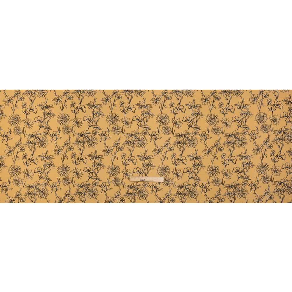 Our Mood Exclusive Beige Doodling Daisies Crinkled Gauzy Viscose Crepe translates nature to art as it displays black contour drawings of flowers against a tan background.