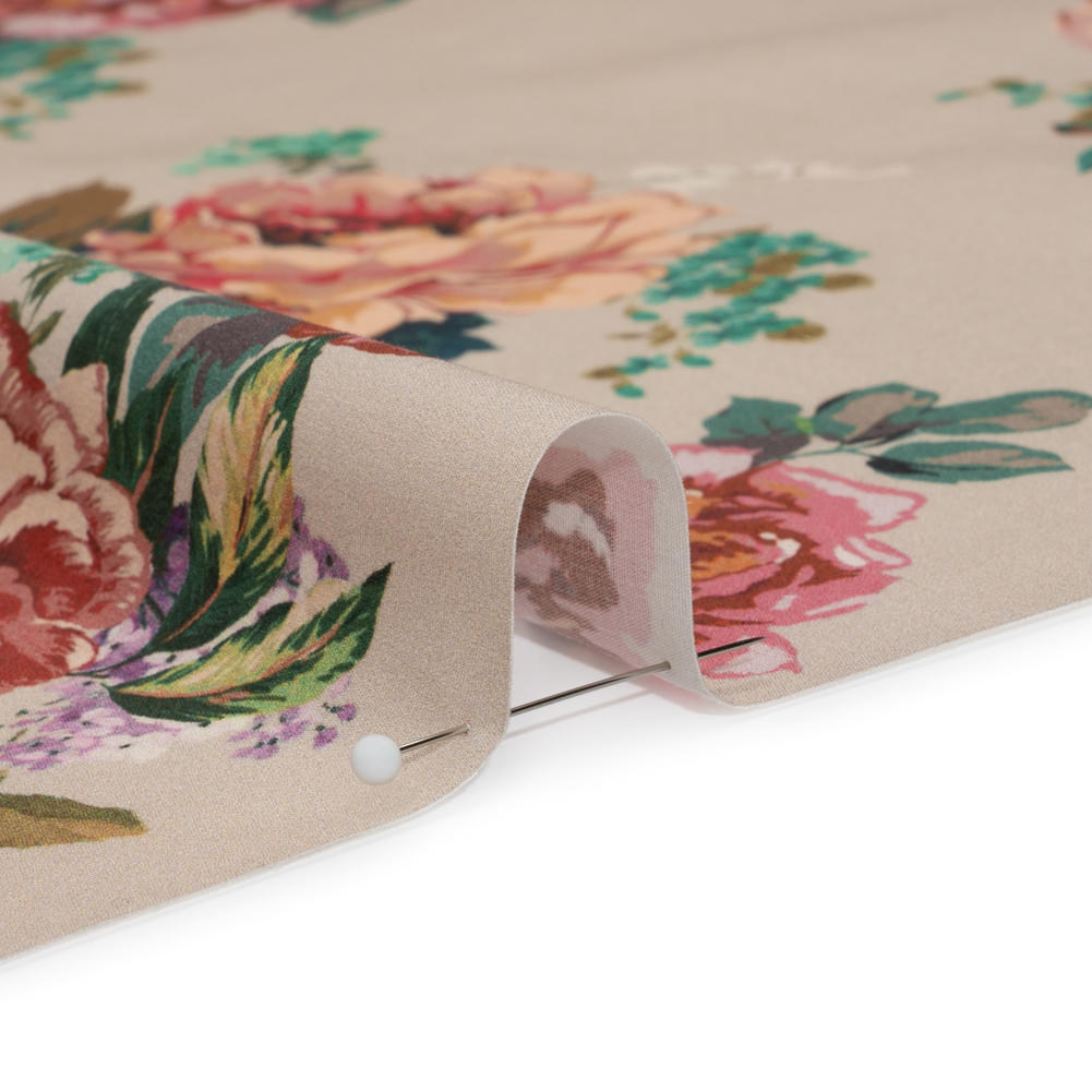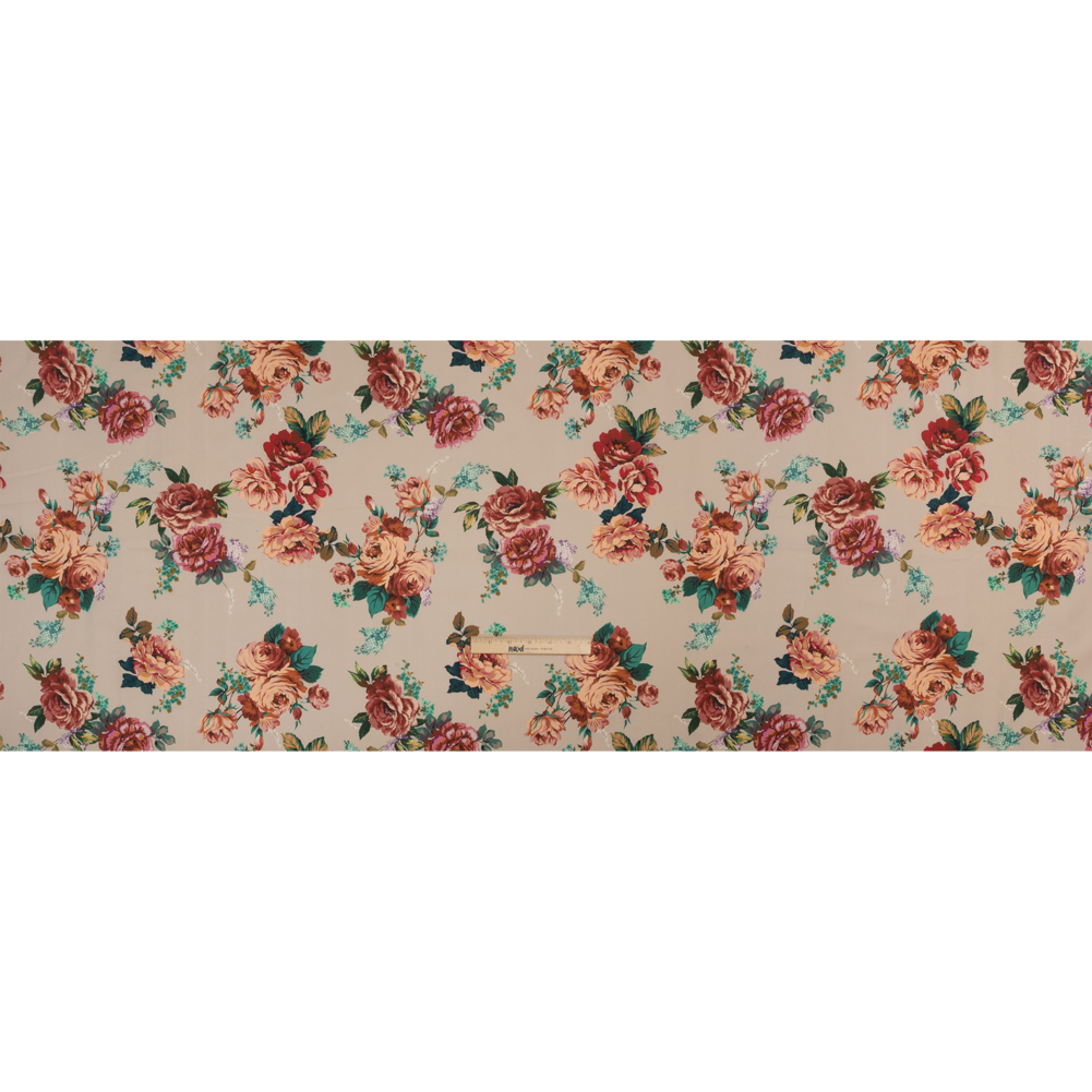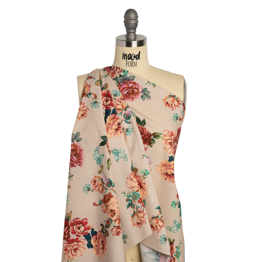Lead a design dynasty with our Mood Exclusive Bekah and Betty Stretch Cotton Poplin, inspired by Victorian sophistication. Taupe's tone is mature and tasteful, bringing a sense of antiquity to the large red roses and dainty hydrangeas. This fabric has a dry hand, malleable drape, and 25% weft-wise stretch. Move in comfort throughout your day with cotton poplin pedal pushers, boxy midriff tops, or chic shirt dresses! While mostly opaque, a lining will increase modesty and add structure to accomplish your desired silhouette.
