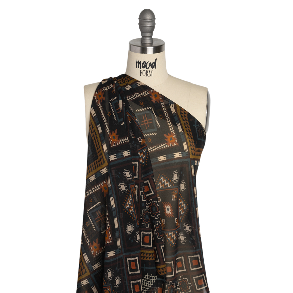 Our Mood Exclusive Black Anything But Deserted Viscose Chiffon mixes the warm desert sun with the cool desert night. Patchwork diamonds cover a black background with orange, gold, cream, and turquoise geometric patterns. This 100% viscose fabric has a grainy feel that, along with its translucent and lightweight nature, is a characteristic of chiffon—the airy drape flirts with the breeze, romanticizing silhouettes of formal and semi-casual wear alike. Create overlays for long gowns and pleated skirts, pair with a lining to create opaque blouses with sheer puff sleeves, and more!