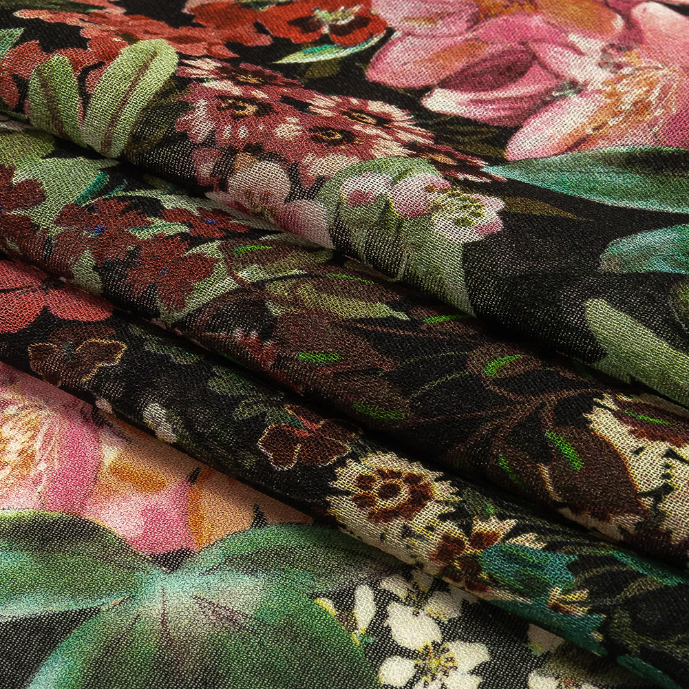I am so happy with this fabric! It was the perfect choice for a soft, flowy wrap dress. The fabric was easy to handle, and I had no issues cutting or sewing it. I did notice shrinkage when washing a swatch so I decided to just make my dress dry clean only. The print is gorgeous, I love the way the flowers and leaves are layered, it looks so lush and dense. I'm contemplating buying more to make something else with it, it's just too good.