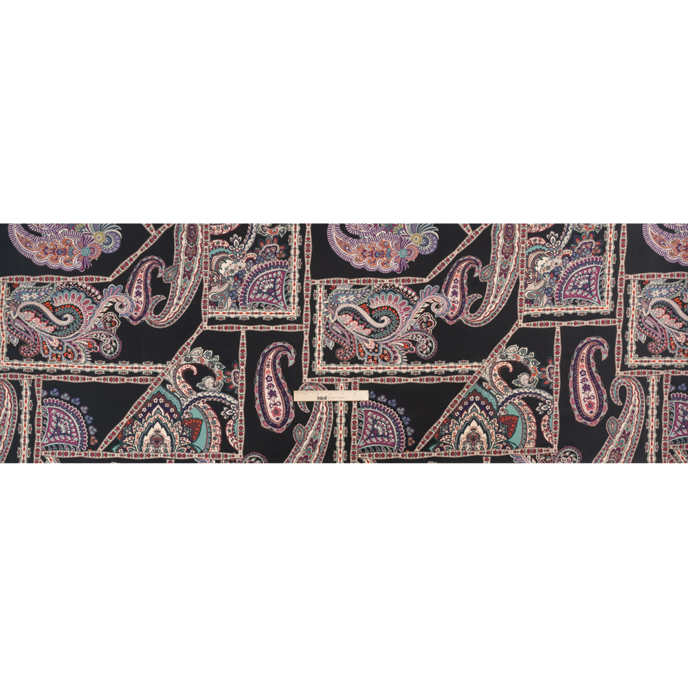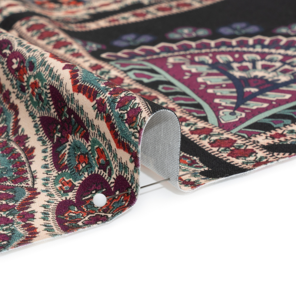 In her lofty mansion full of non-dusty books (they aren't for show, she reads them all), Eloise puts down her tea and reaches for her needle; our Mood Exclusive Black Elegant Eloise Stretch Cotton Sateen is simply delighted to discover the vision Eloise sees for it. Detailed tendrils and paisleys sprawl across black patches, framed with lace-like borders that evoke a sense of antiquated ease. Slightly translucent, a lining may be desired for added opacity.Cotton sateen is the perfect balance between relaxed and refined as a dry, smooth hand meets a glossy finish. Lauded for its breathability, this sateen also features a 10% weft-wise stretch to enhance your comfort during your day-to-day. From trousers and wrap dresses to lightweight jackets and A-line tops, the malleable drape offers itself to casual wardrobes in all climates.