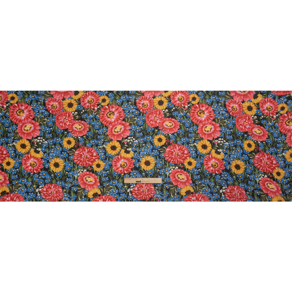 Discover aromatic treasures with our Mood Exclusive Black Floral Trove Viscose Georgette! Overwhelmingly beautiful, you can practically smell the fragrant sunflowers, blue daisies, and red peonies growing against a black background. The crisp, pebbly feel is a characteristic of a georgette, bringing a visual intrigue to the face and a satisfying texture to the hand. Its billowing drape and translucent nature soften silhouettes and create an elegant feel, making it a perfect choice for an overlay on an evening gown or a workplace skirt. Add a lining to create gathered peasant blouses with sheer puffed sleeves and more!