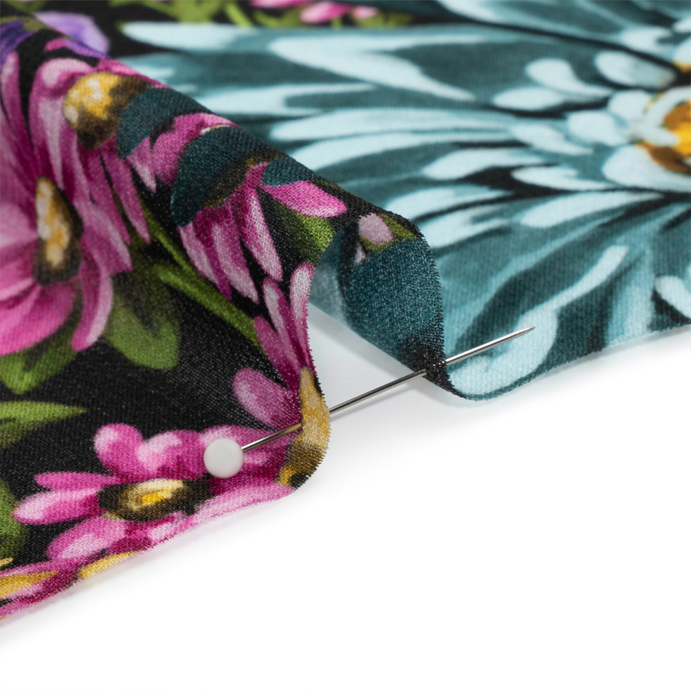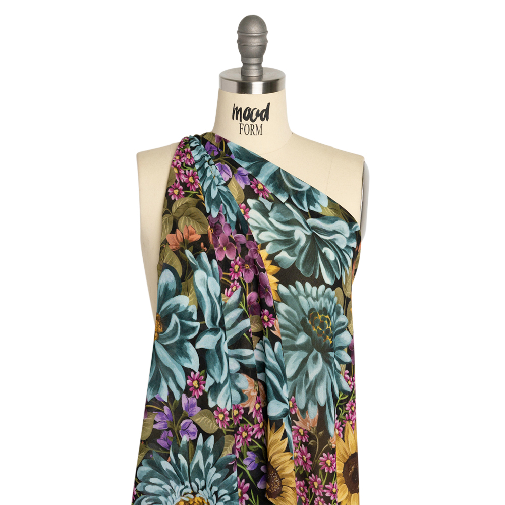 The spring air pulls you into nature, tempting you to run barefoot through our Mood Exclusive Black Sightly Saunters Viscose Georgette. A meadow of large blue, pink, yellow, and purple flowers sprawls over a black background, textured by a crisp, grainy hand. Matte and translucent, this fabric is beautiful as an overlay, a stand-alone sheer garment, or with a lining.From weddings to brunches, cold weather to warm, georgettes cast an ethereal aura over semi-casual and formal occasions. Ideal for layering, pleating, and accentuating your figure, their airy drape inspires romantic gowns, workplace dresses, flowing pants, scarves, and more!