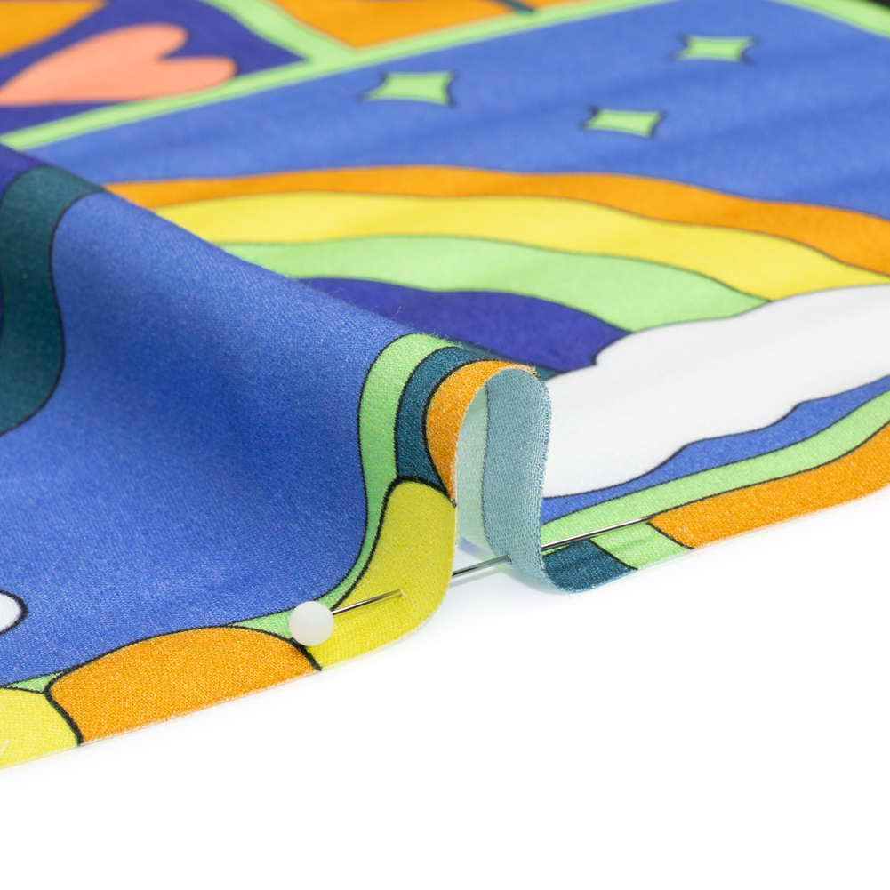 Trust yourself, the drowsy moon says. There’s joy everywhere, the smiling flowers whisper. Through the simplified art style often connected to comics and cartoons, our Mood Exclusive Blue All Love Rayon Challis encourages your imagination to fall in love with the beautiful chaos that we call life. This fabric features a soft, sleek hand and a subtle luster. Demonstrate its lightweight, airy drape with maxi skirts, peplum blouses, and more. Challis is a plain weave fabric that has solidified its place in wardrobes since the Middle Ages. While the content of Challis has evolved from linen to cotton to now synthetic, its connection to elegance has not wavered. For the fashion students, home sewists, and designers, our professional sewists suggest to stay stitch necklines and curves before sewing, use a smaller stitch length on your machine, and finish with rolled hems or French seams. As it is slightly translucent, a lining may be desired.