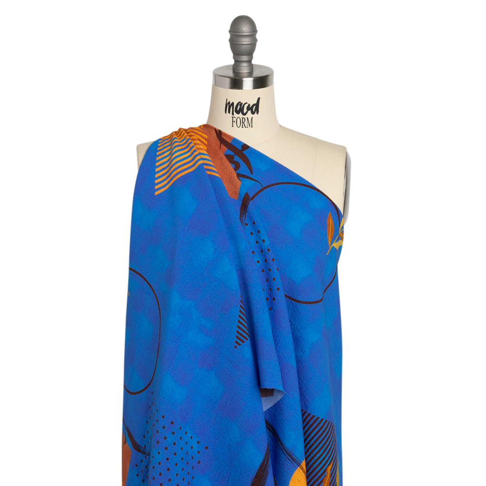 Admire an ancient artform with our Mood Exclusive Blue Calligraph Creator Stretch Polyester Seersucker! The fluid movements of Chinese calligraphy lay in stark opposition to the rigid geometric designs on this hazy blue background, punctuated by the occasional leafy sprig and setting sun.Seersuckers offer a respite from the heat; apart from bringing a unique texture to your everyday and semi-formal garments, the lightweight, puckered face keeps you cool in any climate. Separating this specific seersucker from the rest is its 10% weftwise stretch, a bonus element that boosts its comfort from ahh to ahhhhhh. With its supple drape, create suit jackets, blouses, pinafore dresses, collared shirts, and more! Depending on the project, a lining may be desired.