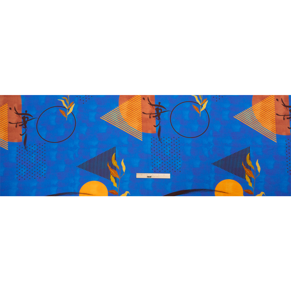 Admire an ancient artform with our Mood Exclusive Blue Calligraph Creator Stretch Polyester Seersucker! The fluid movements of Chinese calligraphy lay in stark opposition to the rigid geometric designs on this hazy blue background, punctuated by the occasional leafy sprig and setting sun.