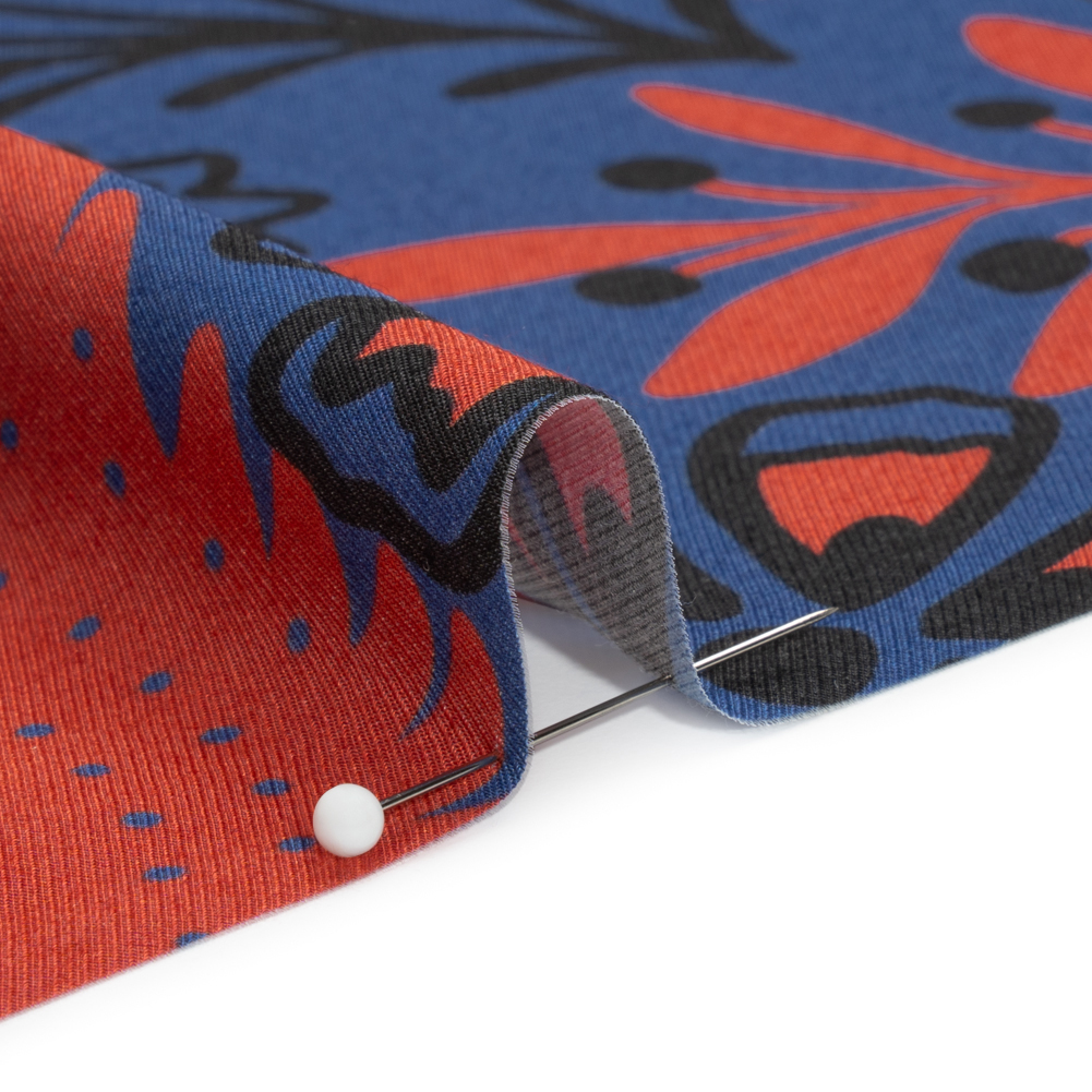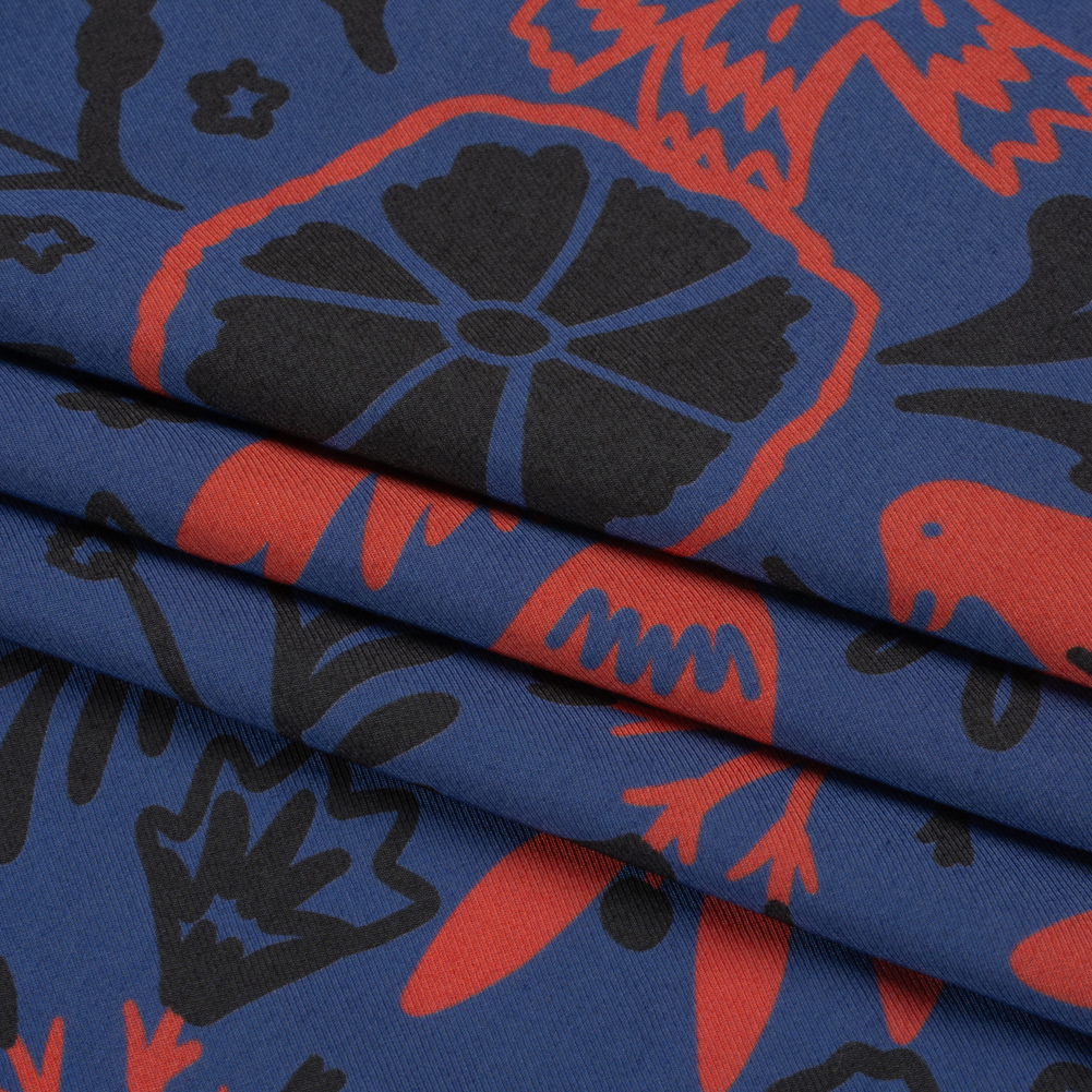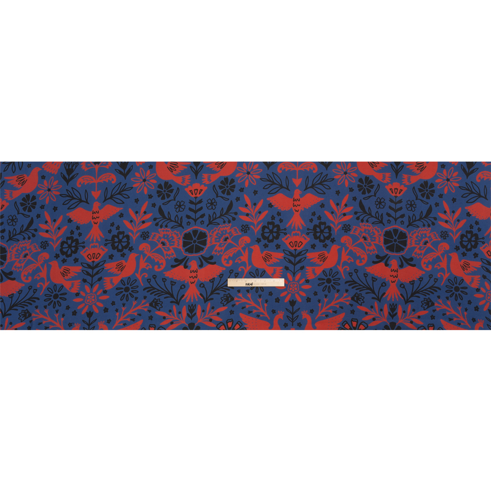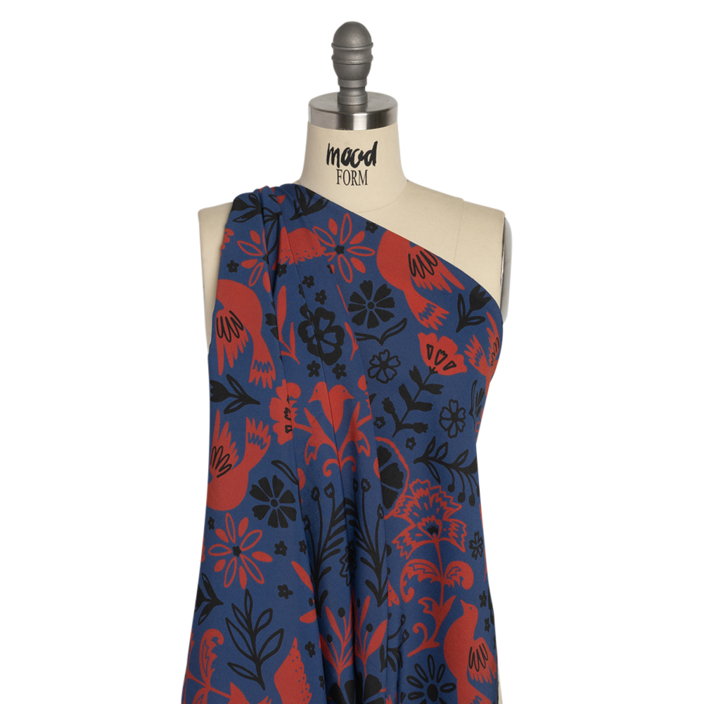 For those who admire starlings and swans—those who listen to the wind whispering ancient myths—our Mood Exclusive Blue Feathered Folklore Sustainable Viscose and Polyester Twill is for you. With their observant eyes, simplistic birds carry good omens into a blue meadow filled with black and red flowers, all painted in a folk-art style. An up-close-and-personal view shows the minute diagonal ribs characteristic of a twill weave, though texturally the face feels sleek and dry. The eco-friendly fiber blend creates a fluid drape and slight luster, perfect for airy dresses, lightweight blouses, lingerie, and more. Translucent; a lining may be desired for added opacity and structure.