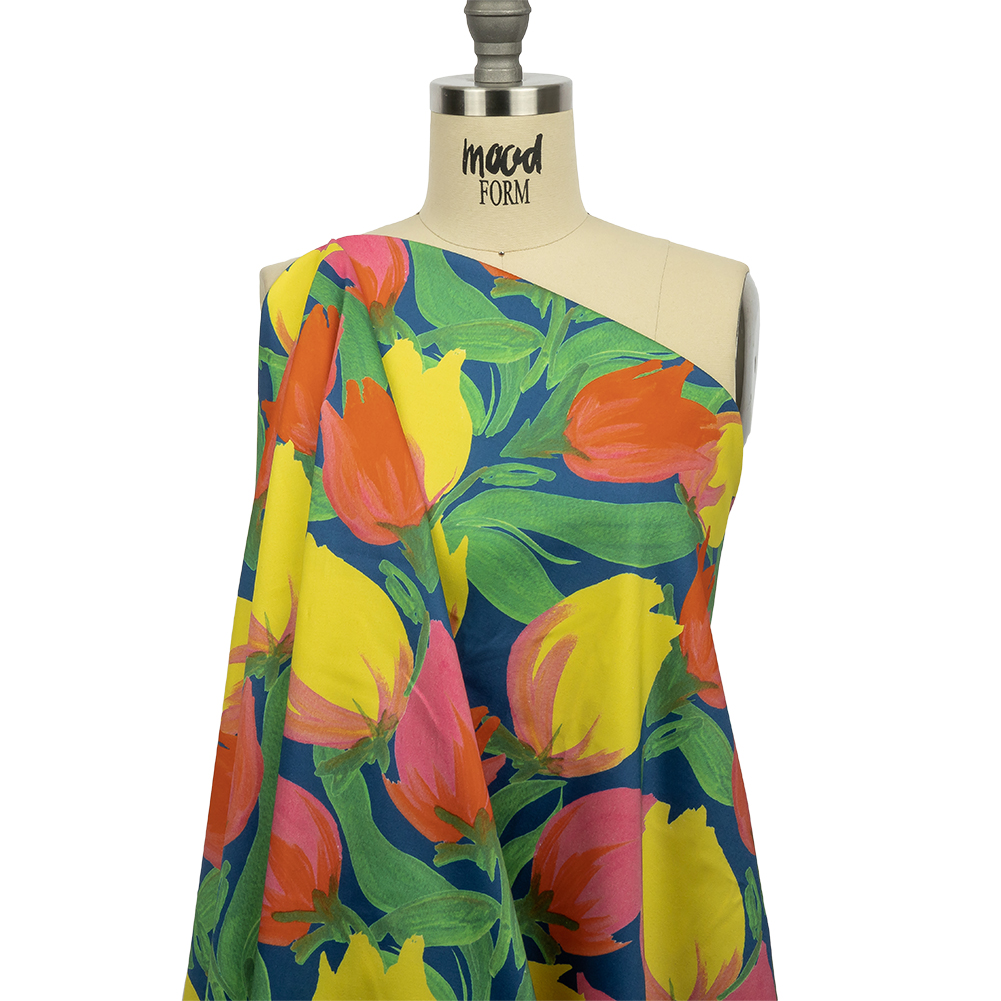 It’s almost tulip good to be true! Pairing painterly tulips with impressively bright colors and making dopamine dressing as easy as pie, our Mood Exclusive Blue Keukenhof Stretch Cotton Sateen is inspired by the eponymous gardens in the Netherlands.
