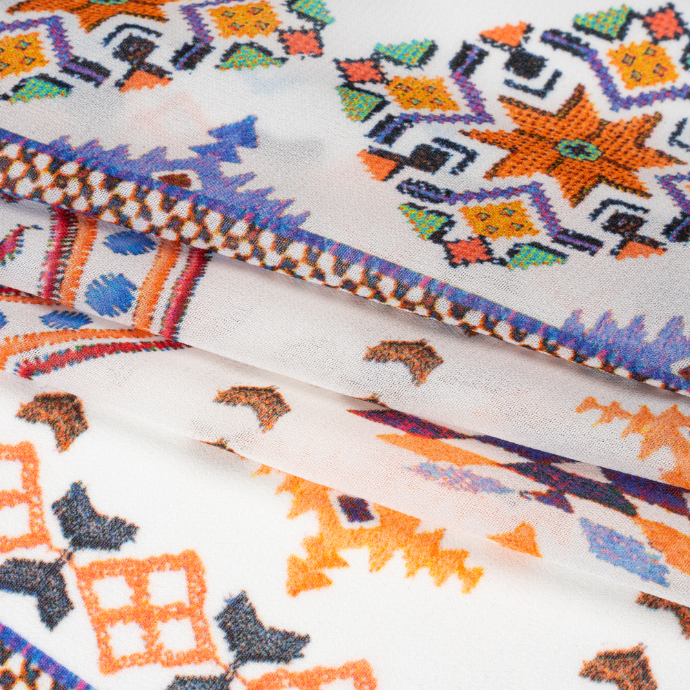 Tradition inspires our Mood Exclusive Blue Needle and Nostalgia Viscose Georgette to thread itself through your modern wardrobe. Exuding a warm nostalgia, printed designs of needlepoint flowers and embroidered patterns decorate a white background in orange, blue, yellow, red, and green. It features a matte finish and a crisp, grainy hand. Made entirely of viscose, this breathable fabric is an affordable route to dressed-up days in gorgeous garments. From a wedding to the office, cold weather to warm, georgettes cast an ethereal aura over semi-casual and formal occasions. Ideal for layering, gathering, and accentuating your figure, their airy drape inspires romantic gowns, workplace dresses, flowing pants, scarves, and more! As it is sheer, a lining may be desired.