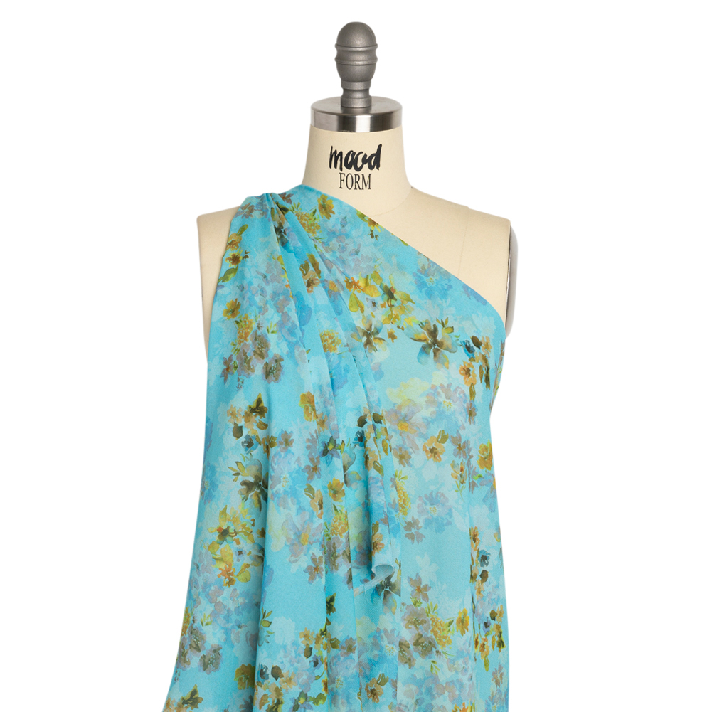 Let our Mood Exclusive Blue Promise of Spring Viscose Georgette fill you with hope! Green, yellow, and blue flowers are painted in watercolors against a blue background. The crisp, pebbly feel is a characteristic of a georgette, bringing a visual intrigue to the face and a satisfying texture to the hand. Its billowing drape and translucent nature soften silhouettes and create an elegant feel, making it a perfect choice for an overlay on an evening gown or a workplace skirt. Add a lining to create gathered peasant blouses with sheer puffed sleeves and more!