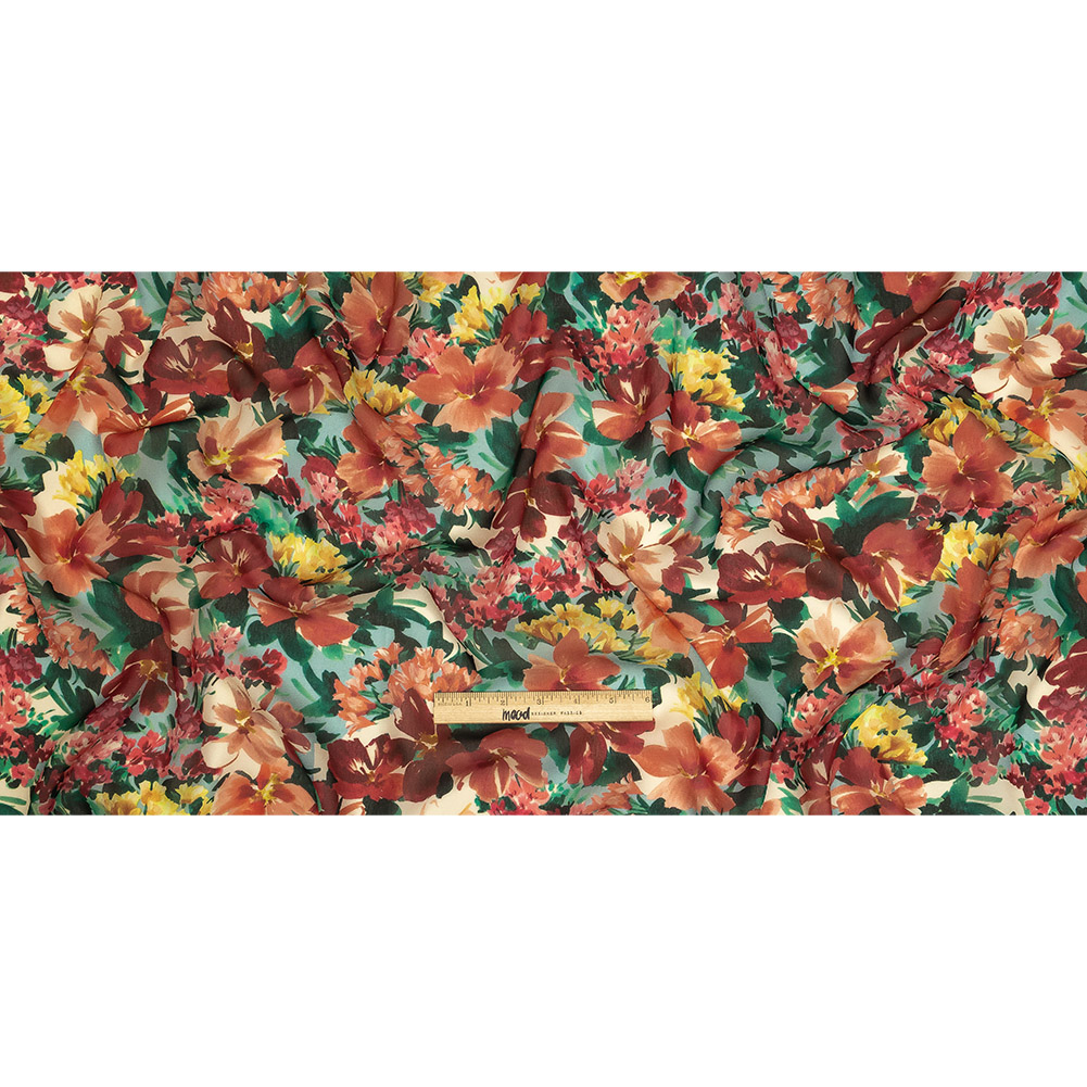 When the light begins to dim, settle in with a loved one for an adventurous date night in our Mood Exclusive Blue Tahitian Twilight Viscose Georgette! Inspired by the idyllic island, hibiscus flowers bloom amongst yellow tulips against a dusk blue sky, evoking beachy sunsets and a sense of wanderlust. Light and airy in hand, georgette boasts crepe's distinctive texture while bearing a slightly heavier, yet still rippling drape. Take advantage of these desirable qualities with gathered peasant blouses, dramatic dusters, or overlays on skirts, both casual and dressy. Sheer, a lining is recommended for full opacity, if desired.
