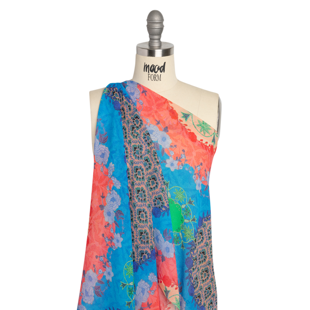 The perfectly landscaped Villa d'Este inspires our Mood Exclusive Blue Villa of Vitality Viscose Georgette! Gardens hang like ornaments on a bright blue background, displaying ornate patterns and vivacious lawns that exude the vitality of and Italian primavera. Matte and translucent, this grainy fabric is beautiful as an overlay, a stand-alone sheer garment, or with a lining. From weddings to brunches, cold weather to warm, georgettes cast an ethereal aura over semi-casual and formal occasions. Ideal for layering, pleating, and accentuating your figure, their airy drape inspires romantic gowns, workplace dresses, flowing pants, scarves, and more!