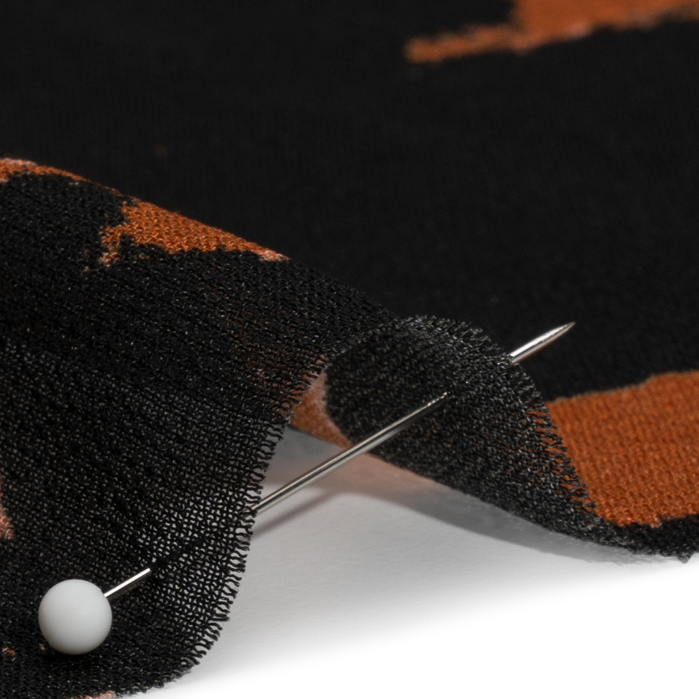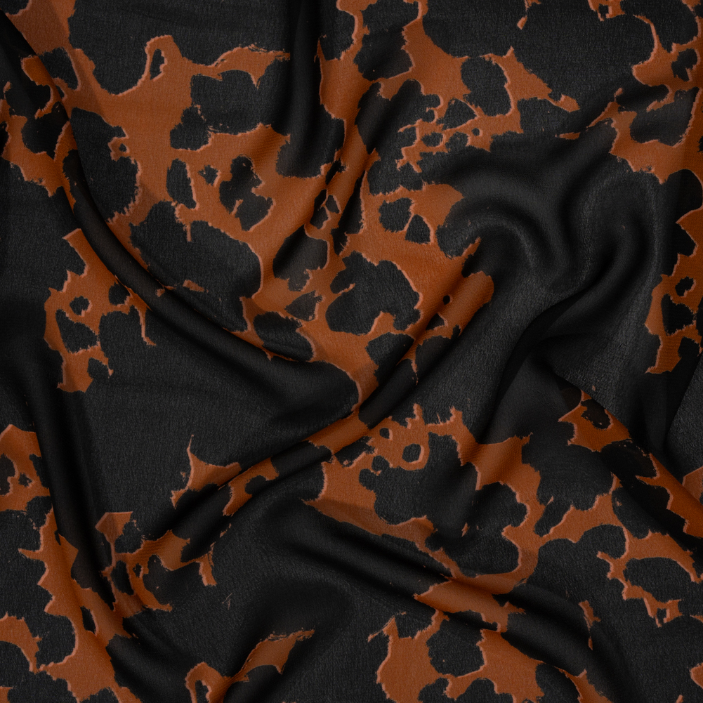 You’ll always find yourself returning back to our Mood Exclusive Brown Back to Zanzibar Viscose Georgette, inspired by the infectious energy of the wildlife on the tropical Tanzanian island. Large black spots pop out from a dark orange background, surrounded by discreet peach shadows. Its billowing drape, grainy hand, and translucent nature soften silhouettes and create an elegant feel, making it a perfect choice for an overlay on an evening gown or a workplace skirt. Add a lining to create gathered peasant blouses with sheer puffed sleeves, and more!