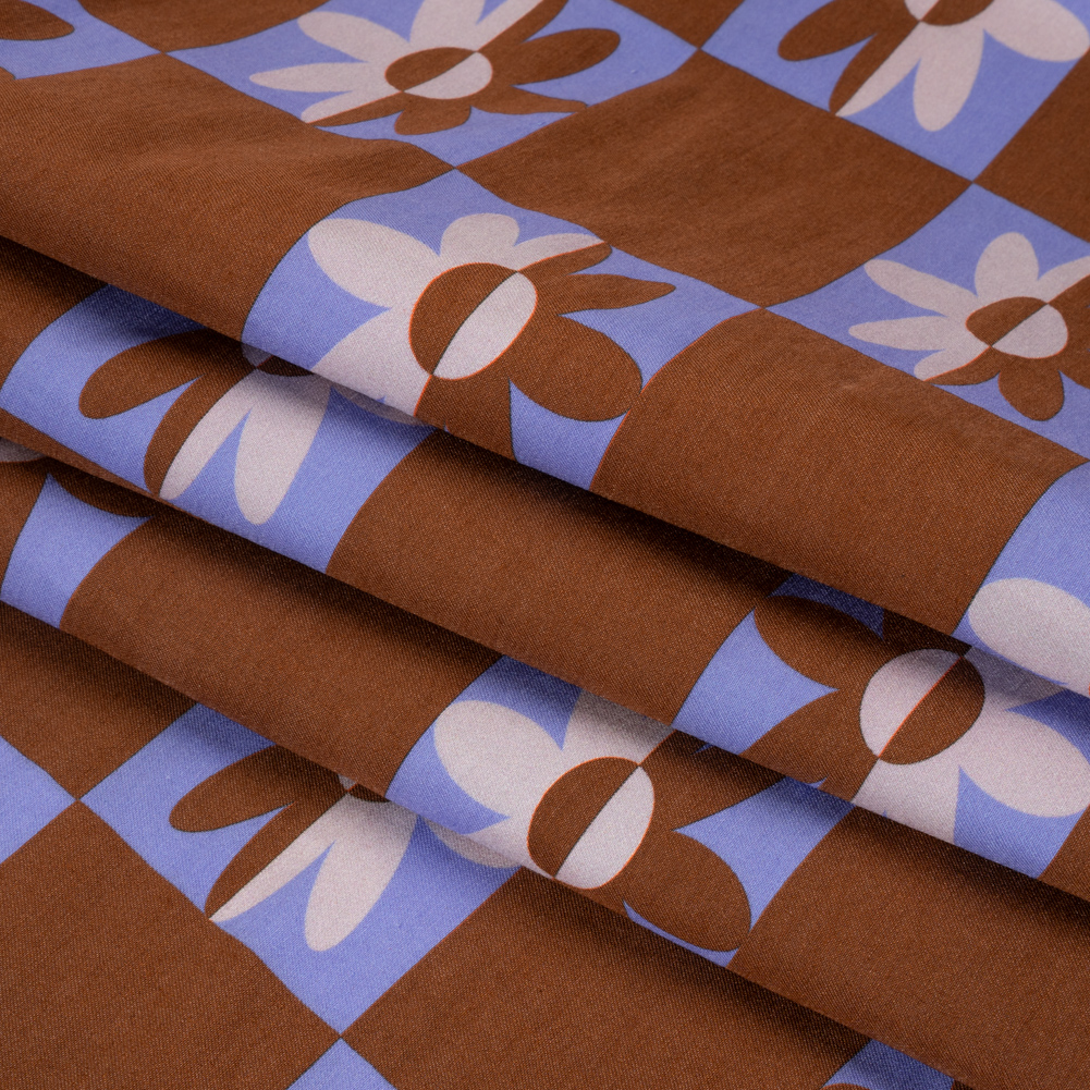 Check our Mood Exclusive Brown Check Yourself Stretch Viscose and Polyamide Twill off your to-do list! This playful pattern features a brown and periwinkle checkerboard decorated with dual-toned daisies for a trendy and cute look. The durability of the synthetic fiber blend is strengthened by a twill weave, creating a pebbly face and a sleek reverse. Featuring a semi-structured drape and a 25% warp-wise stretch, this fabric tells your personal style story through lightweight jackets, wrap dresses, pants, and more. Mostly opaque; a lining may be desired for added structure.