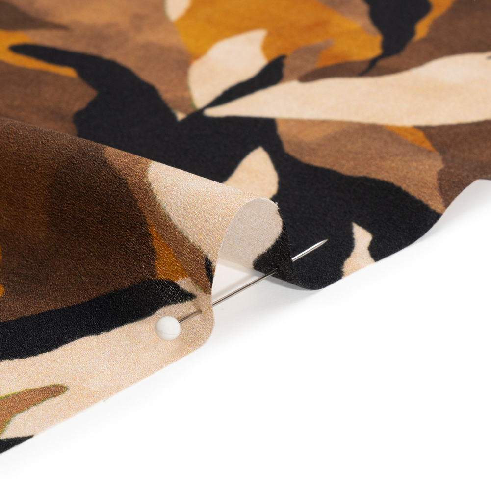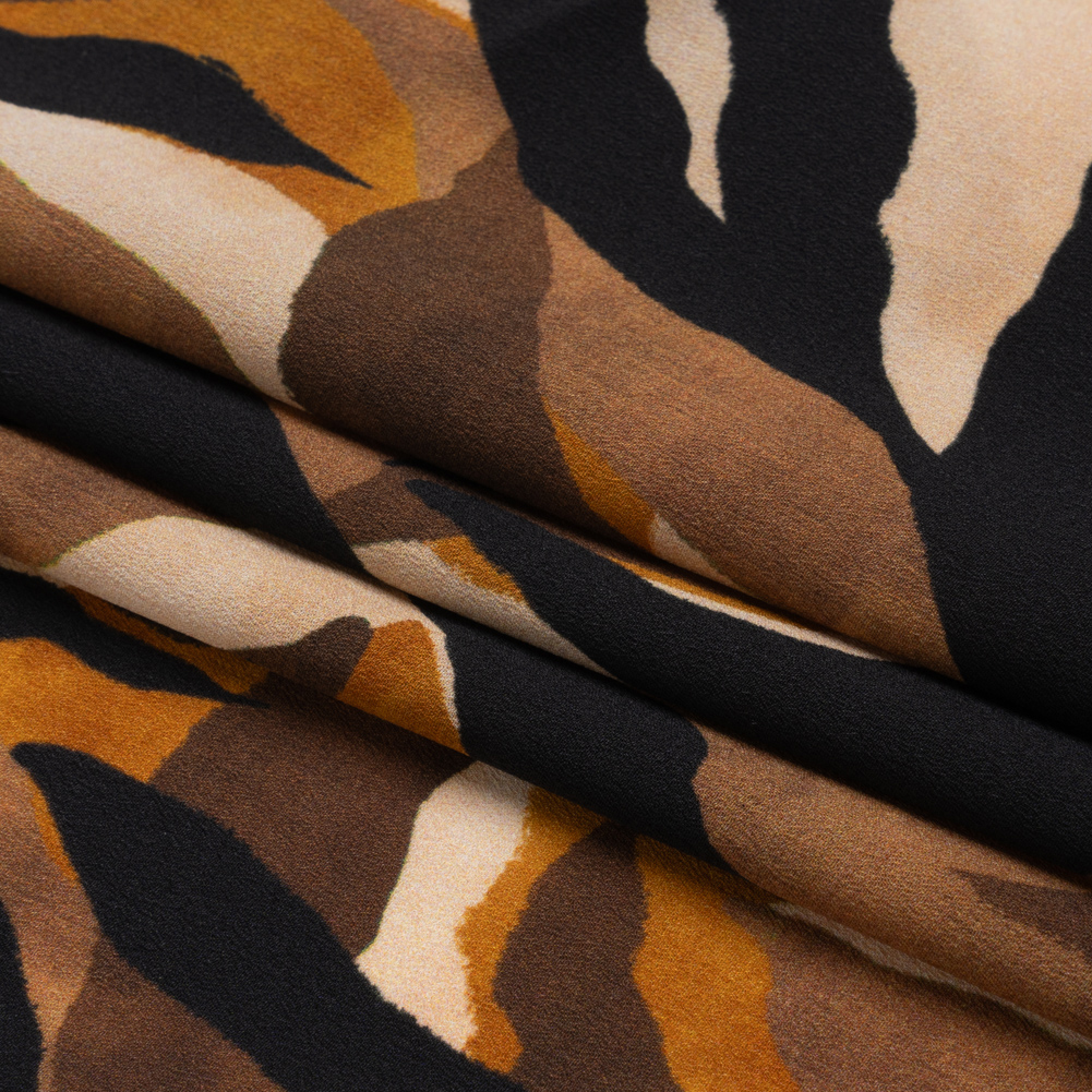 Our Mood Exclusive Brown Drowsy in Daintree Lightweight Polyester Crepe paints the Australian rainforest in the light of the setting sun. The face is a wild collection of dark brown, tan, orange, and black streaks—reminiscent of zebra stripes—coming together to form a camouflage-like pattern. A pebbly hand gives way to an airy drape, making this lightweight fabric comfortable during the summer at formal functions and everyday events. Maxi dresses, pleated skirts, blouses, and wide-legged pants; this fabric will find its way into every future sewing project. As it is semi-sheer, we suggest a lining to achieve complete opacity.