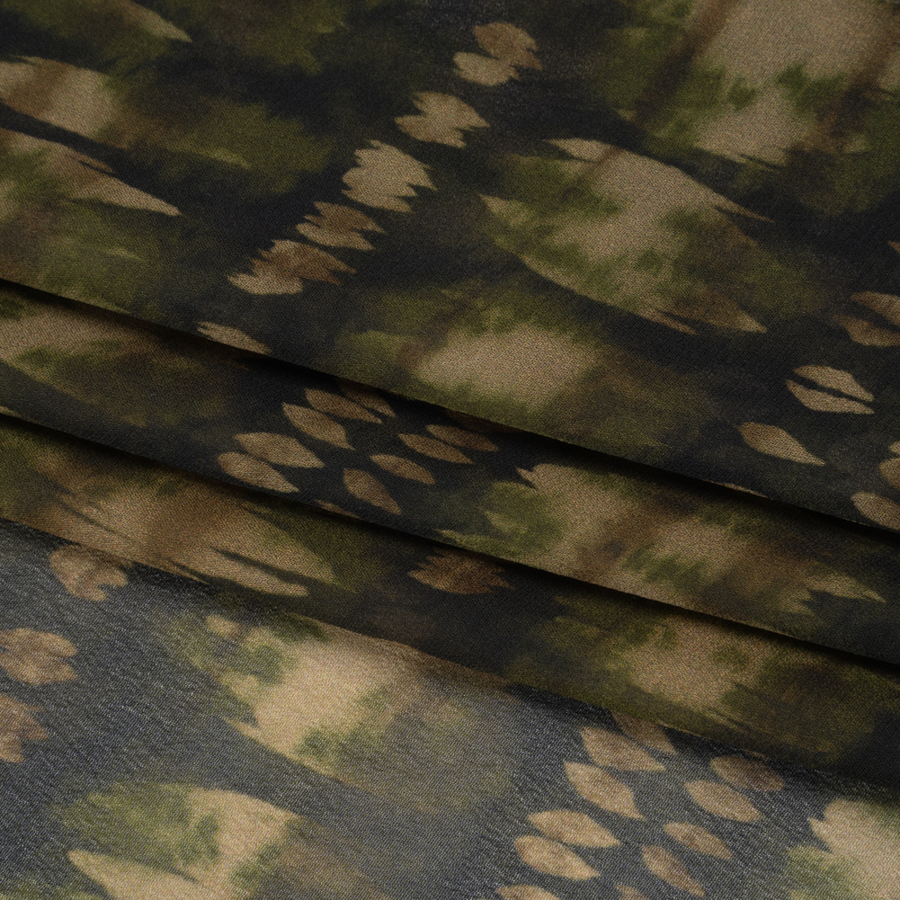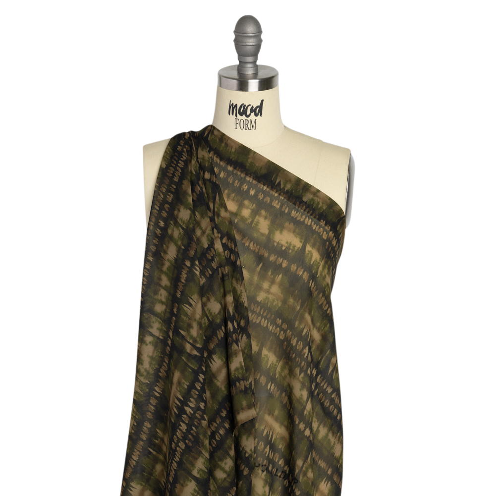 As water droplets slip from a stalactite, a crystal-clear echo metronomes through the darkened cave. Inspired by the murky underground sights, this Mood Exclusive Cavernous Creations Viscose Chiffon explores the undiscovered caverns beneath our feet. In a tie-dyed manner, a hazy dark green background parts for oblong beige sections, mimicking caves' entrances. This 100% viscose fabric has a grainy feel that, along with its translucent and lightweight nature, is a characteristic of chiffon. The airy drape flirts with the breeze, romanticizing silhouettes of formal and semi-casual wear alike. Create overlays for long gowns and pleated skirts, pair with a lining to create opaque blouses with sheer puff sleeves, and more!