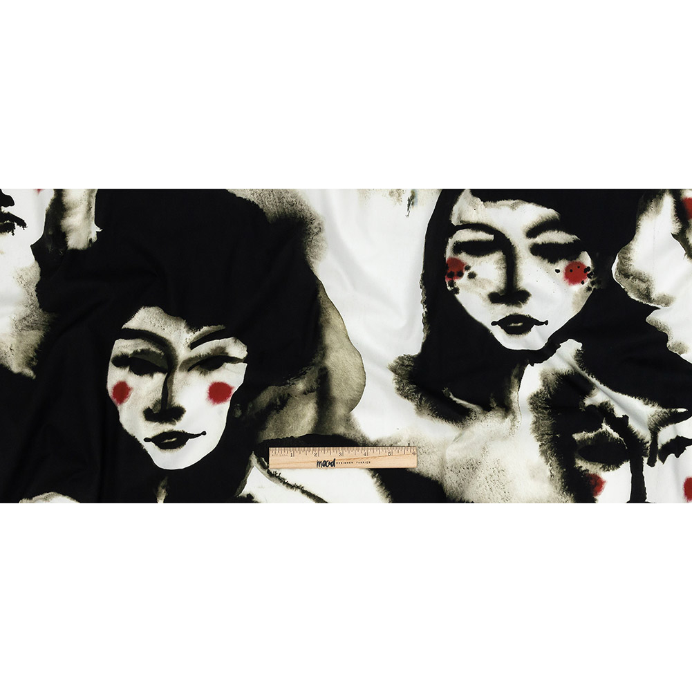 Inspired by traditional Japanese portraits with a whisper of the supernatural, our Mood Exclusive Caviar and Red Unearthly Portrait Cotton Poplin is as striking as it is ghostly. This unique pattern features the repeating outline of a woman's face in a watercolor style, the edges bleeding together on a white background. While primarily black with red highlights, the illusion of spreading ink creates a deep, sinister green color. A smooth, crisp hand and a flexible drape join forces in perfect harmony, creating this lightweight cotton poplin with a slight mechanical give. Despite its slightly translucent nature, a lining is optional but not required, and, in actuality, this fabric is ideal for the warmer months, but can be layered for a more wintry look. Consider using this poplin to craft structured dresses as well as breathable paneled shirts.