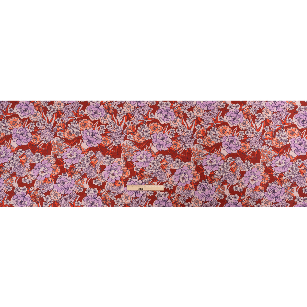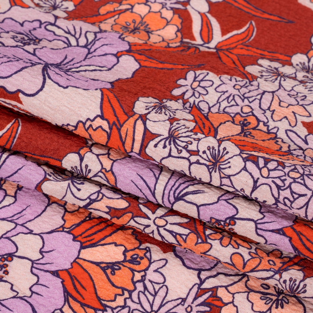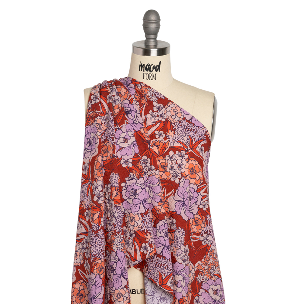 Our Mood Exclusive Cherry Blossom Lessons Stretch Polyester Seersucker finds cherry blossoms in high bloom—but not for long. The quick life of these purple and orange flowers reminds us that life is as fleeting as it is beautiful.Seersuckers offer a respite from the heat; apart from bringing a unique texture to your everyday and semi-formal garments, the lightweight, puckered face keeps you cool in any climate. Separating this specific seersucker from the rest is its 10% weftwise stretch, a bonus element that boosts its comfort from ahh to ahhhhhh. With its supple drape, create suit jackets, blouses, pinafore dresses, collared shirts, and more! Depending on the project, a lining may be desired.