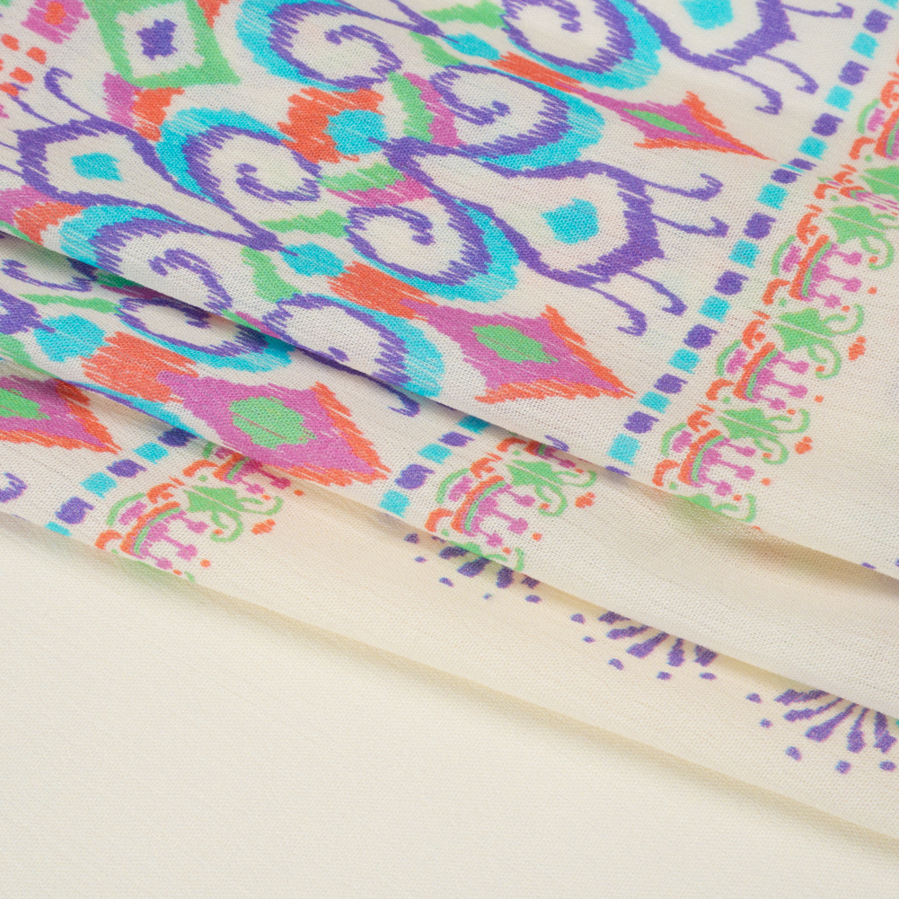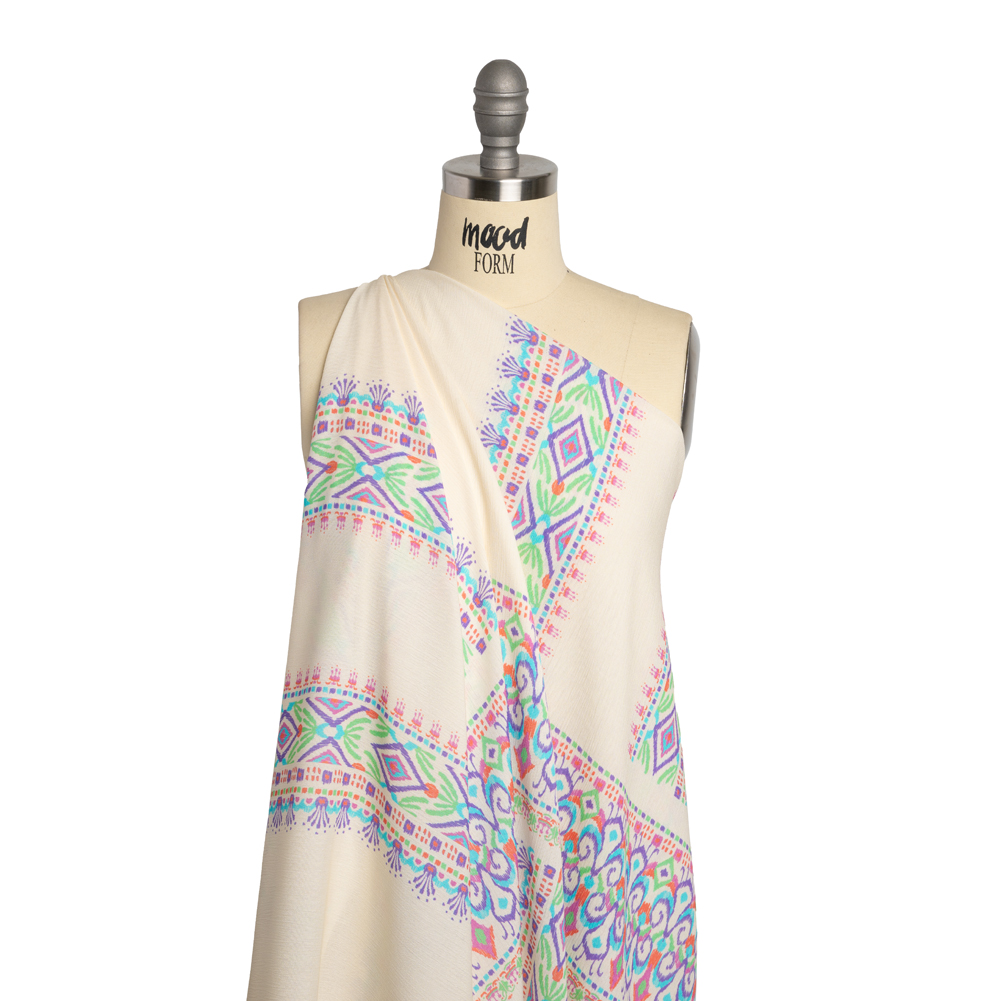 In the kingdom of creativity, our Mood Exclusive Color Castle Gauzy Wrinkled Rayon Woven Panel rules. Vibrant geometric and floral motifs stand in columns against a cream background, holding up a horizontal pattern that runs from selvage to selvage. Boasting a relaxed look with its wrinkled surface and dry, slightly tactile hand, this uniquely woven rayon promises a fluid, soft drape. Lightweight and airy, create bohemian-style summer dresses, airy blouses, breezy maxi skirts, or chic palazzo pants sure to keep you cool—and stylish—all summer long. Due to its gauzy nature, a lining may be desired to add opacity or structure! Please Note: This panel measures 53" wide by 32" long.