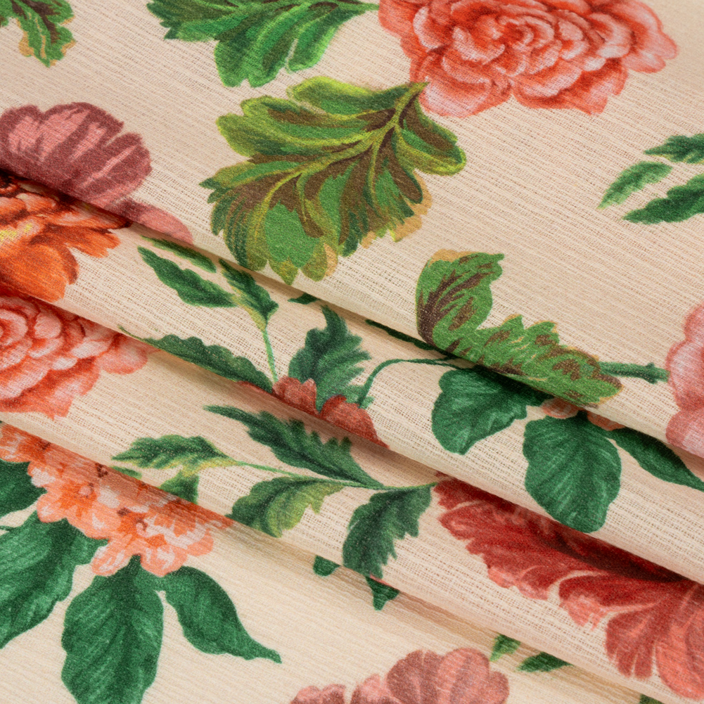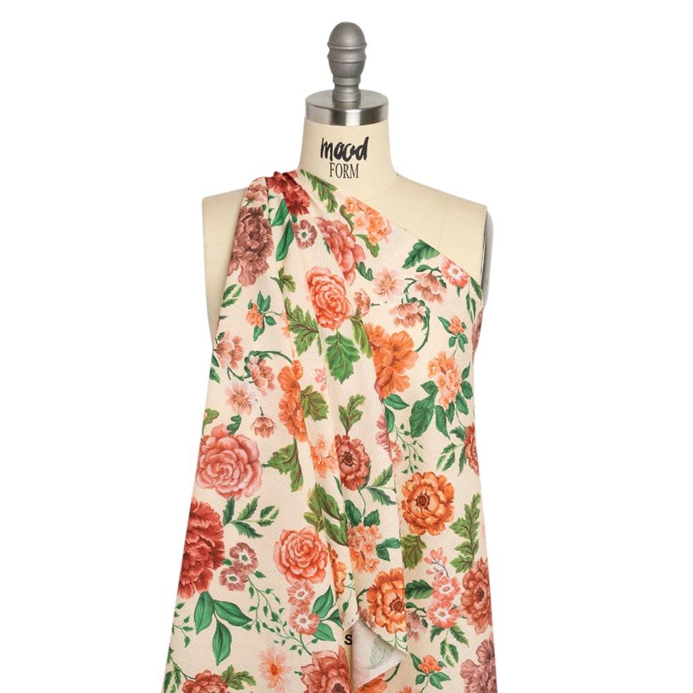 Your love is not lost in translation with our Mood Exclusive Cream Fluent in Love Slubbed Gauzy Cotton Woven as roses shout your affection from the rooftops. The simple act of gifting bouquets affirms to your lover that you're there for the long run; against a cream background, mauve and pink flowers await to be chosen for this game of love. Easy-going energy is emitted from the gauzy hand and slubbed face, sitting cool against your skin even in the warmest of climates. Enhanced by a lightweight drape, this semi-sheer fabric brings a casual and ethereal feel to wrap blouses, maxi skirts, sundresses with ruffled sleeves, and more! A lining may be desired.