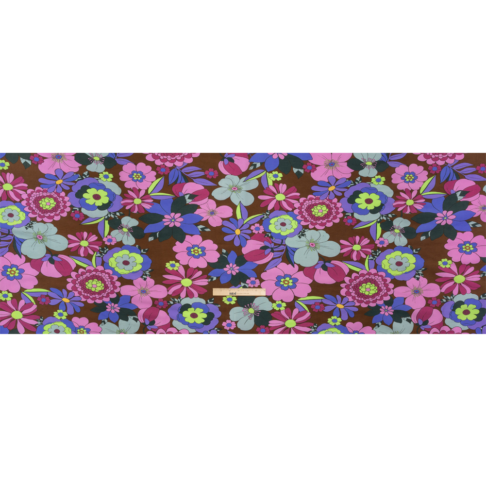 Feel floral with our Mood Exclusive Daisy Delight Stretch Viscose and Polyamide Twill, displaying a brown field filled with large magenta, pink, indigo, light blue, and lime green petals.