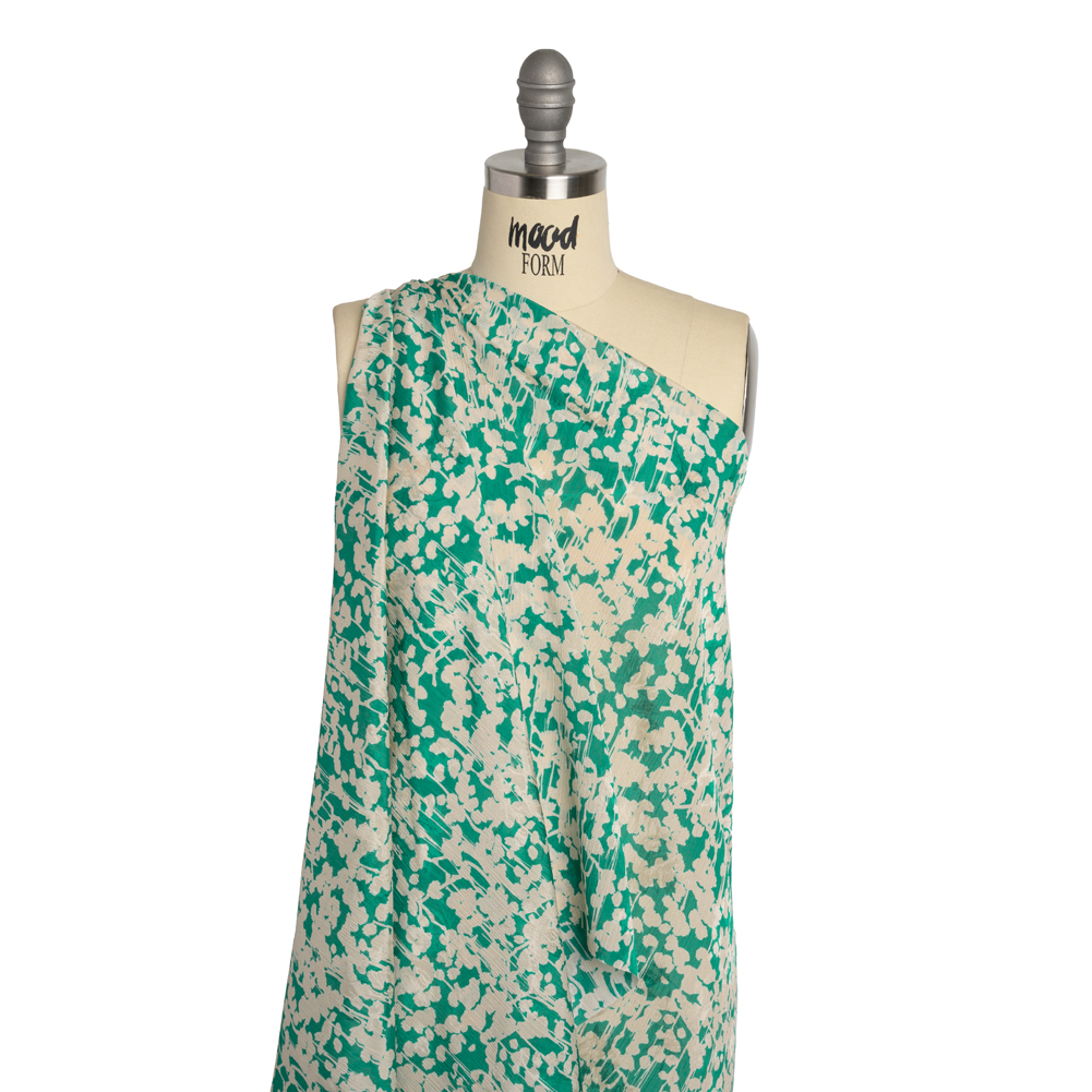 Sunlight slips between leaves, creating a mottled pattern over your blanket and face—this Mood Exclusive Dappled Daydreams Leafy Polyester Jacquard captures an afternoon nap in the shade. Silhouettes of stems, leaves, and flower buds take on an almost abstract appearance in bright teal green and cream. Luxury comes easy to this fabric, thanks to a crinkled texture interrupted by a subtle woven leafy design that shines in the light. Airy and billowing with plenty of fascinating texture, it’s perfect for high-neck blouses with ruffled details, handkerchief hem skirts, and breezy V-neck gowns. Semi-sheer, consider a lining for full opacity and additional structure when desired.